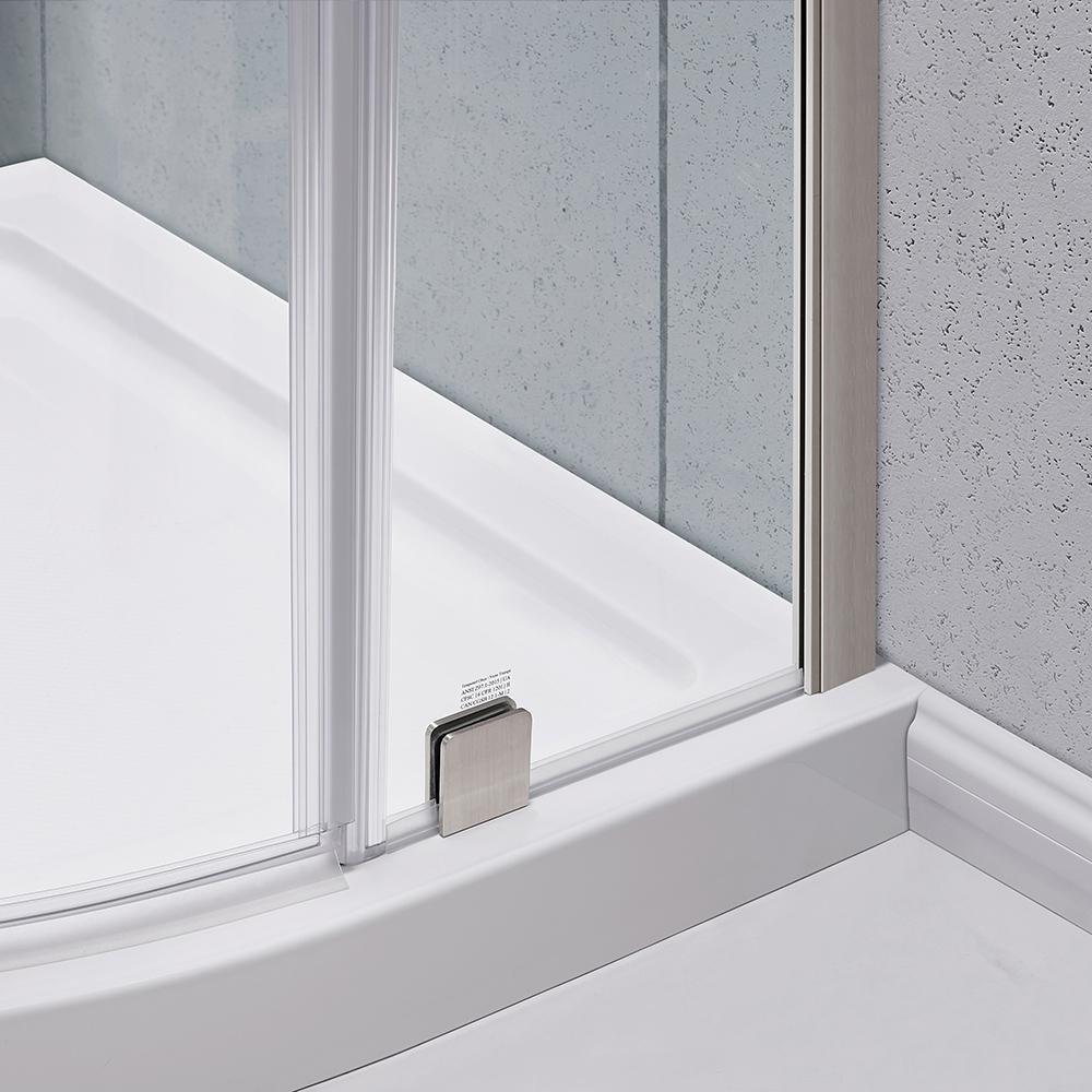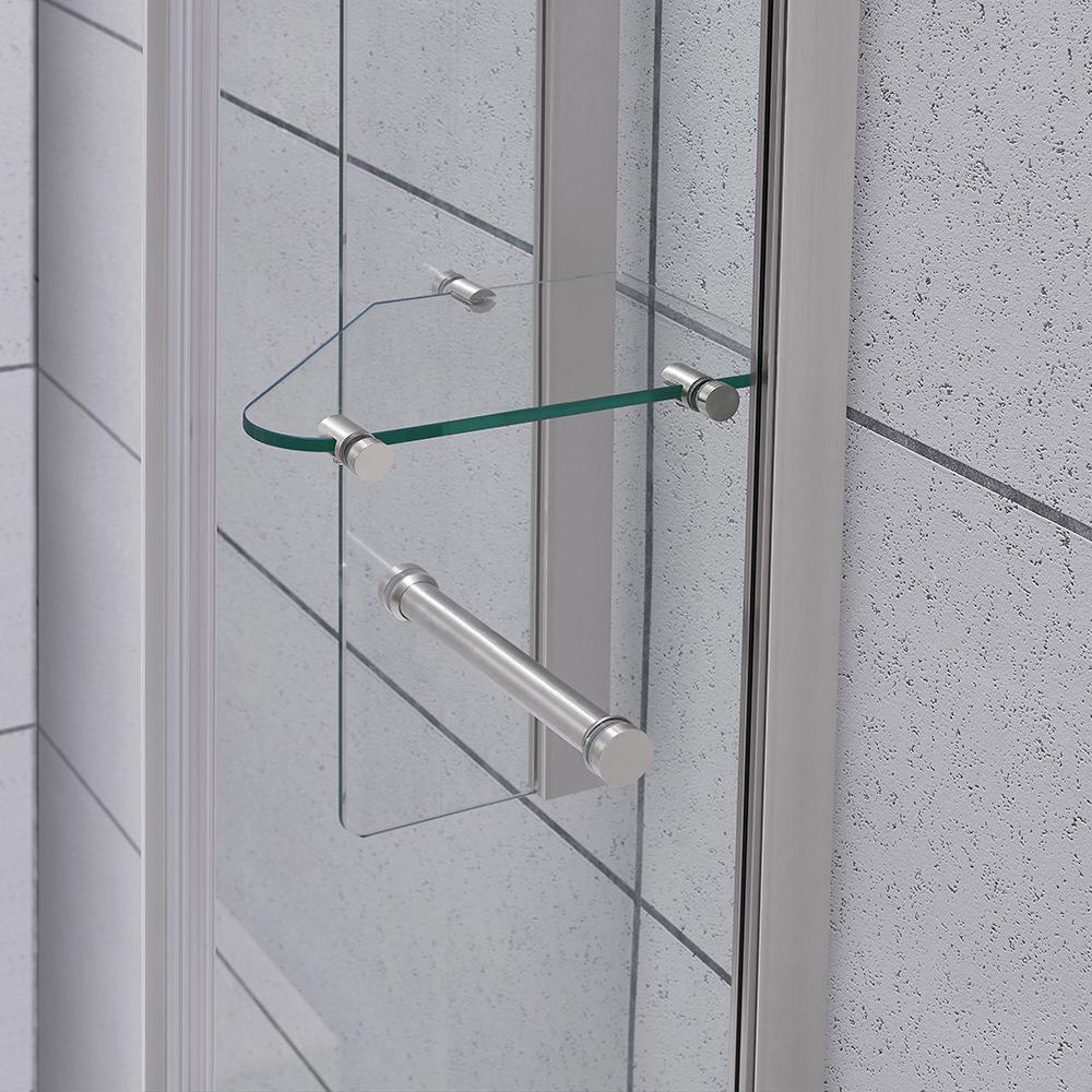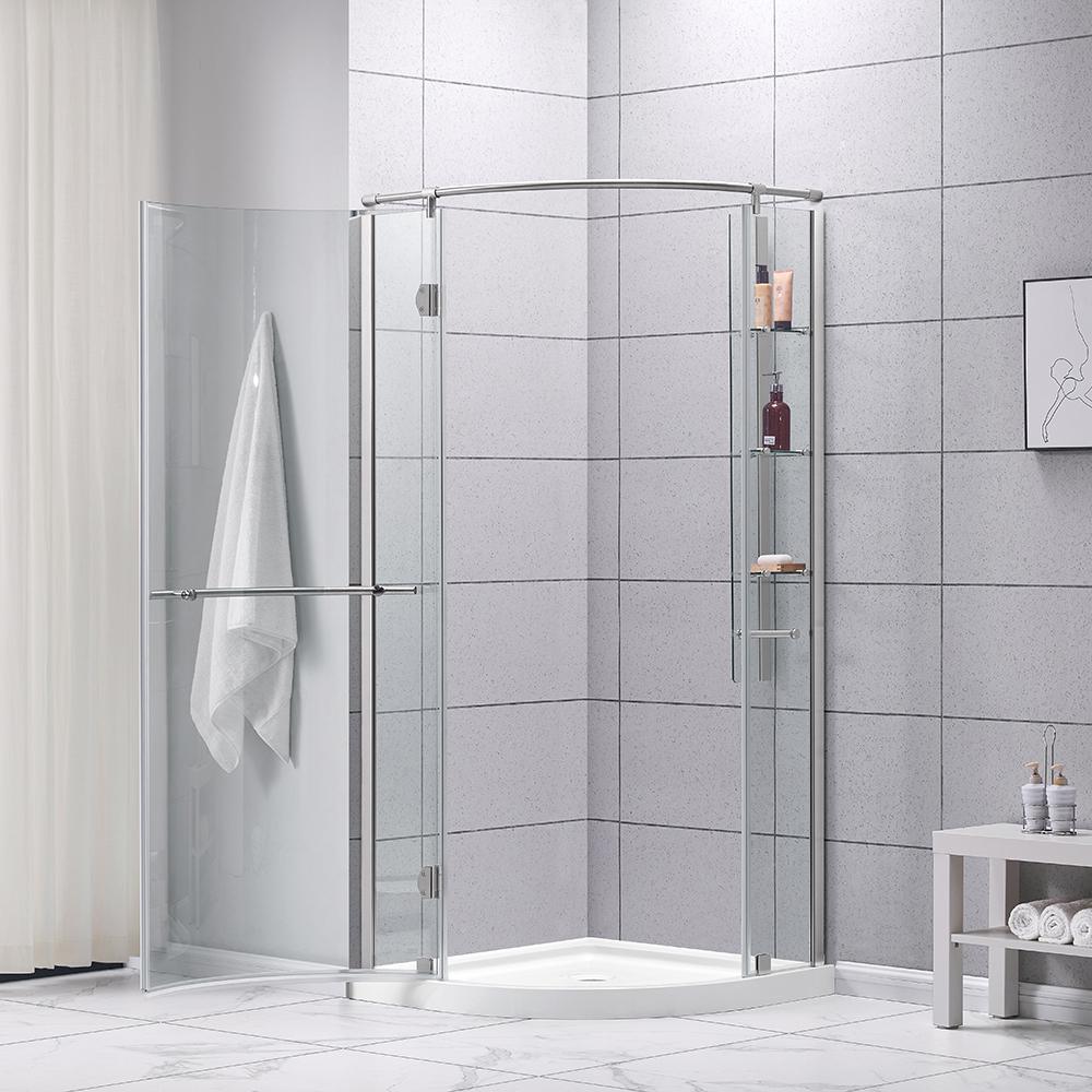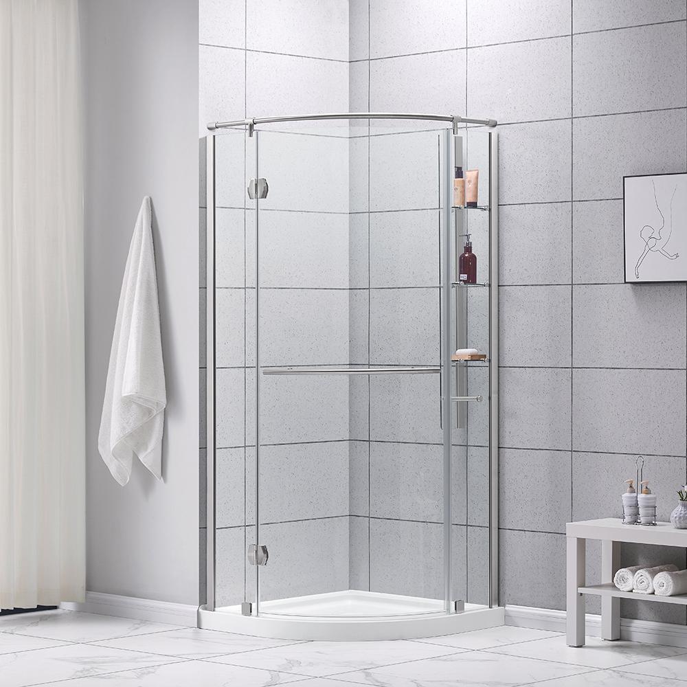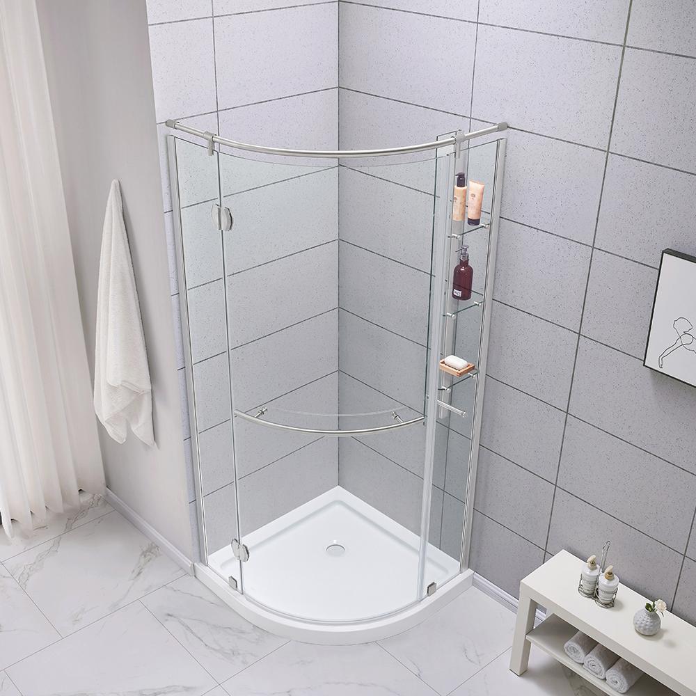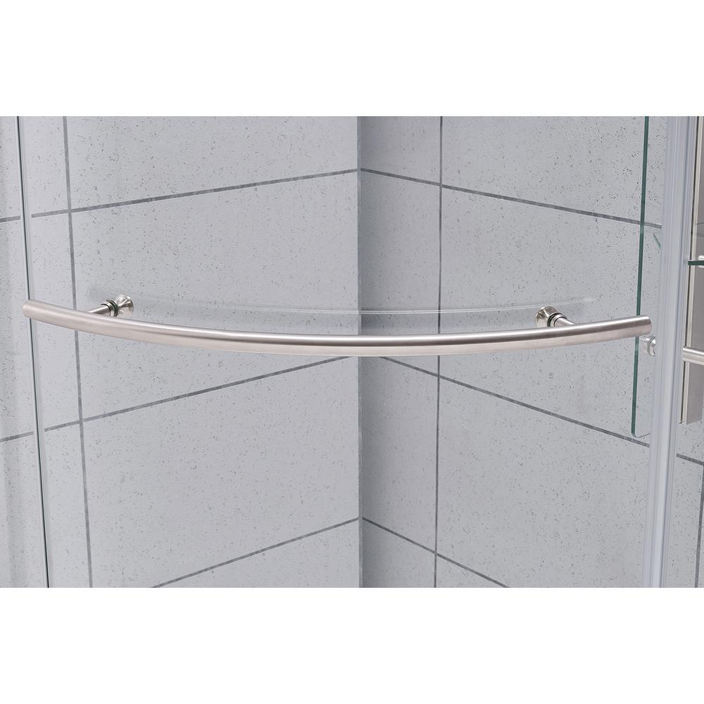Add some glam to your life with the luxurious Glamour 32 in. semi-frameless round corner shower kit by Glacier Bay. Its stunningly curved pivoting glass door is hugged by the echoing curves of a wide horizontal satin nickel handle and striking top chrome support rail - perfect for showing off your bathrooms beautiful tile. Smart storage starts with 3 clever suspended glass corner shelves plus a satin nickel washcloth hanger. Kit includes the low profile base in classic white, with your choice of right or left door installation, for a one-stop solution to your bathroom renovation.