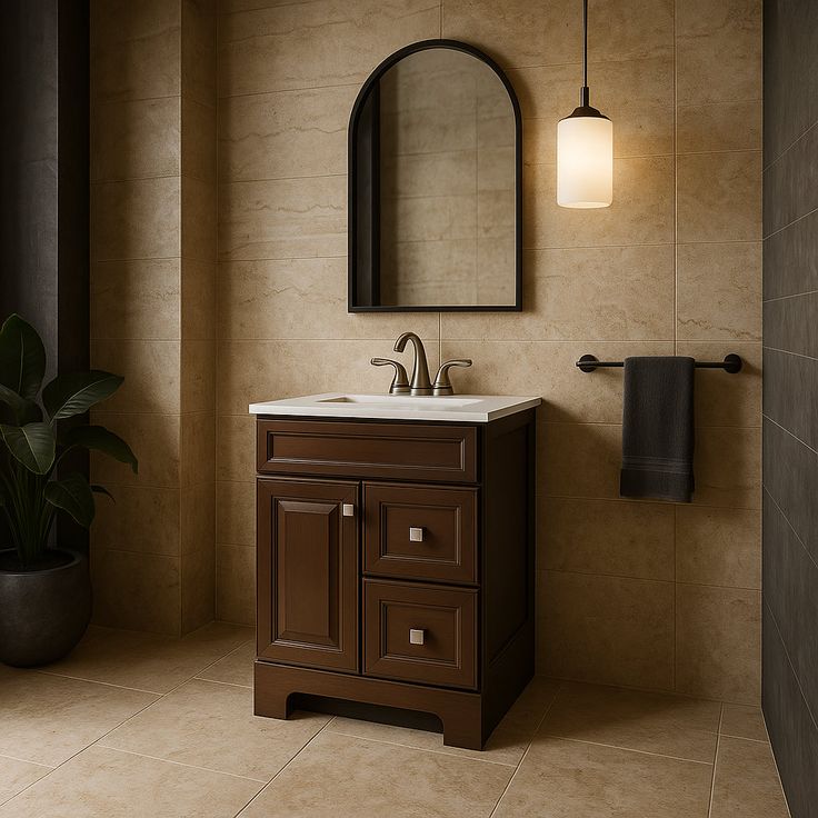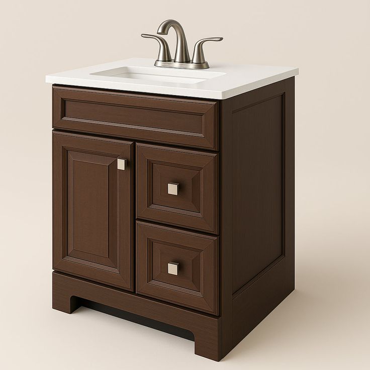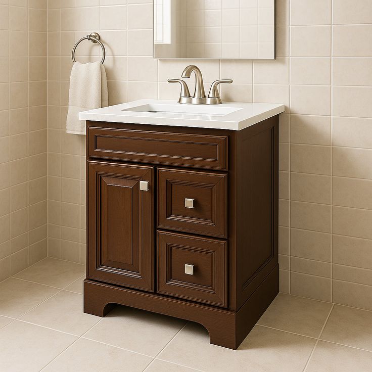 The Sedgewood Vanity combines compact design with elegant style, featuring a Dark Cognac finish and solid surface technology top. Perfect for small bathrooms, it offers customizable storage and easy installation.
