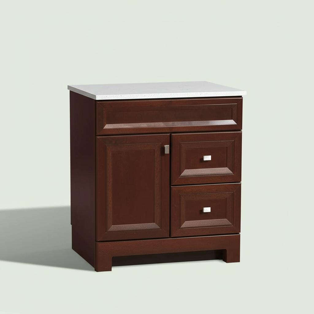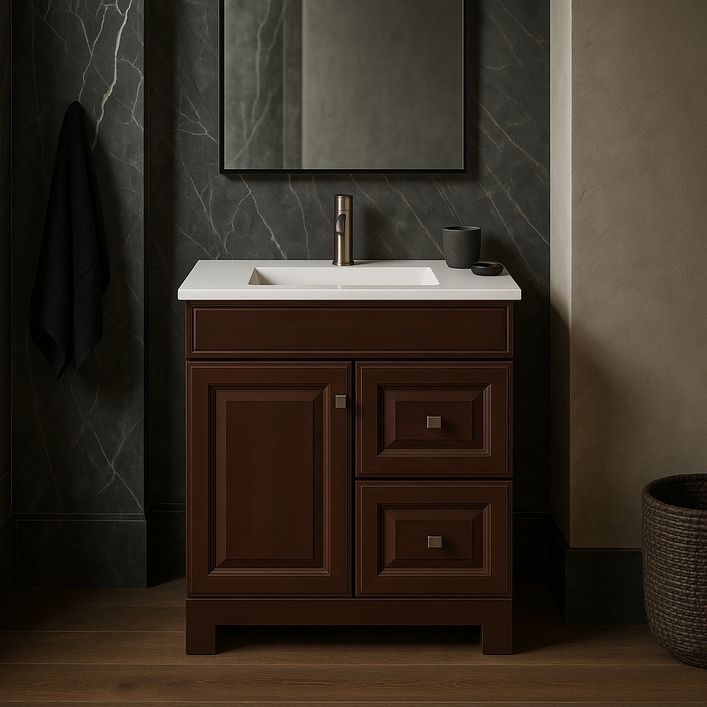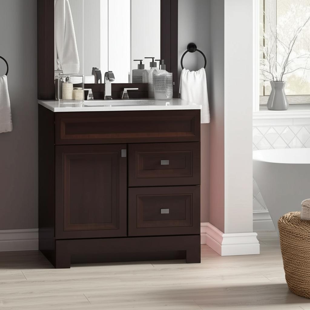 The Sedgewood 30.5 in. Bathroom Vanity combines compact design with elegant style, featuring a Dark Cognac finish and solid surface technology top. Perfect for small bathrooms, it offers customizable storage and easy installation.