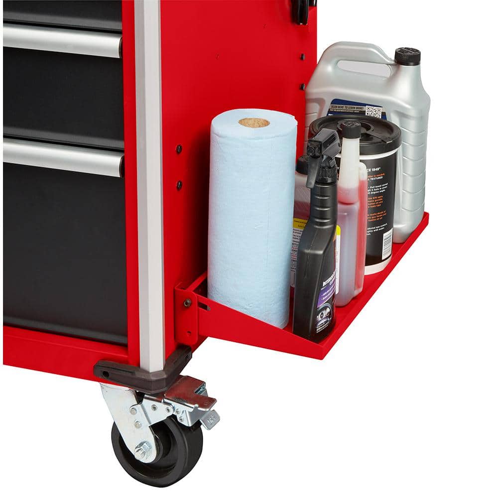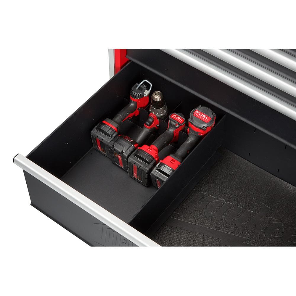 This mobile workbench grounds the garage with bold red steel and a refined stainless top—powerful and polished in one gesture. The knurled side handle and aluminum edge guards add tactile detail, while soft-close drawers deliver a smooth, satisfying cadence. Style it with coordinated Milwaukee tools and keep chargers mounted on the integrated power bar for a streamlined, professional look. A true essential for a luxe, hardworking workshop.