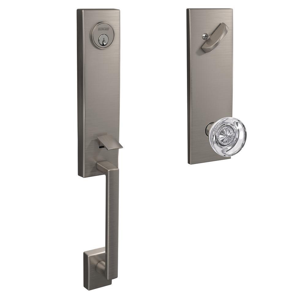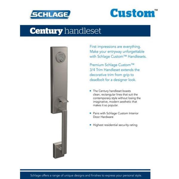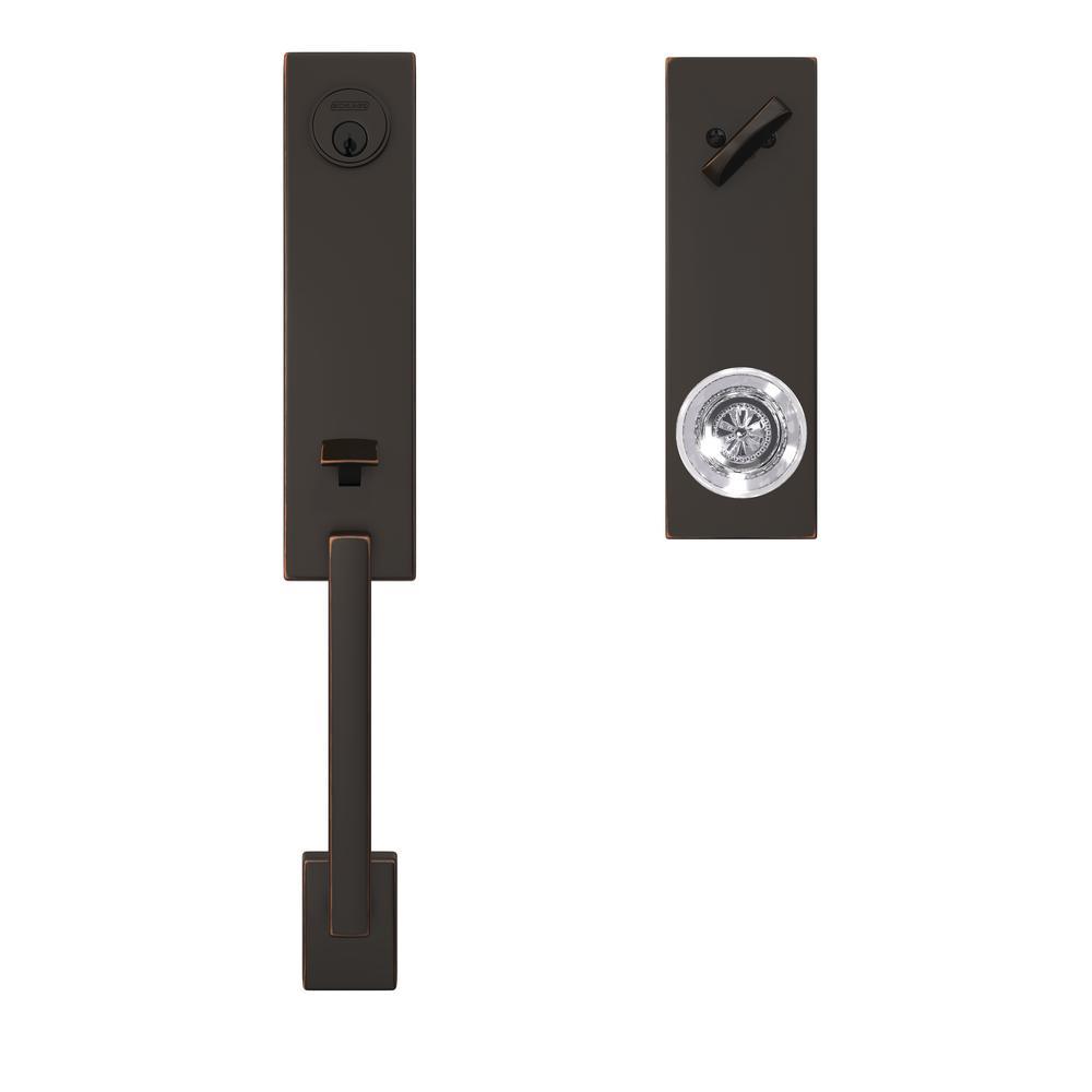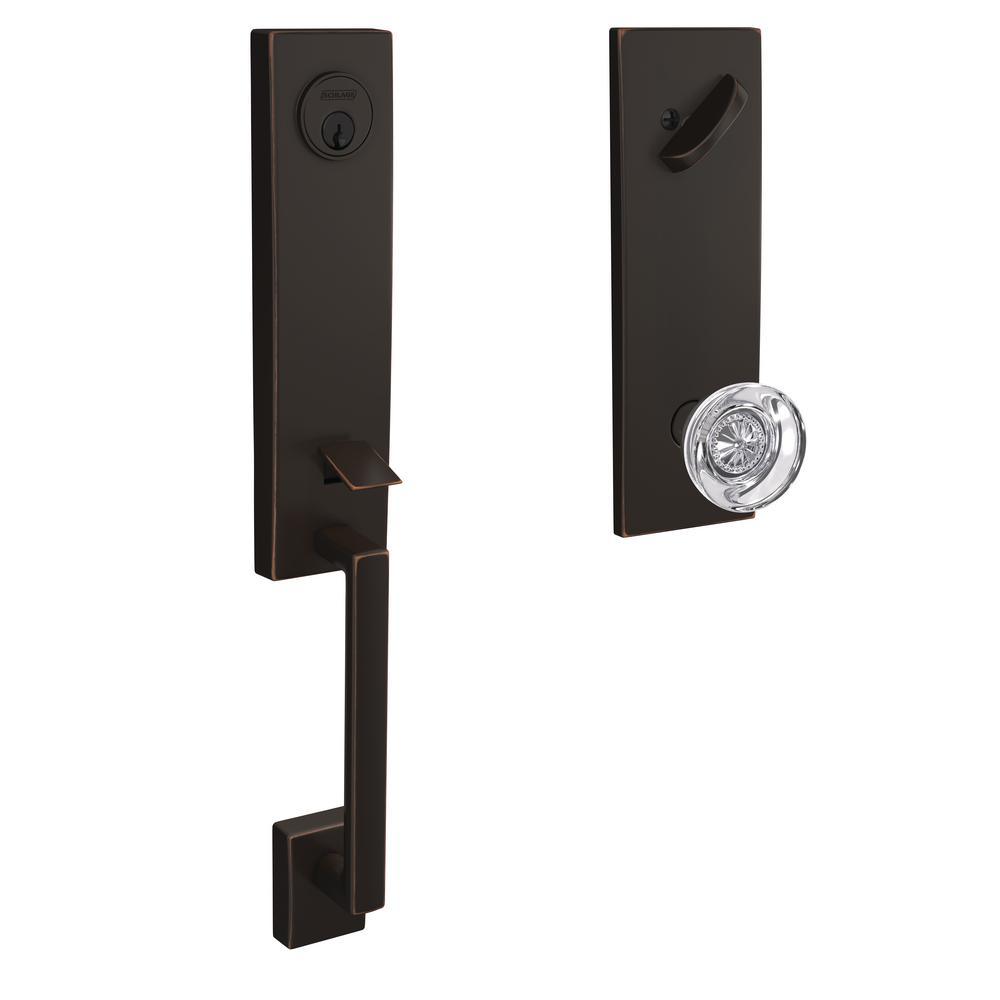The ultimate in entryway style, the Schlage Custom Century 3/4 in. Trim Single Cylinder Handle set with Hobson Glass Knob (Aged Bronze) makes your front door unforgettable. Extended 3/4 in. trim from grip to deadbolt creates a high-style designer look. The Hobson glass knob is the perfect high-end statement piece for styles ranging from traditional to eclectic transitional, while the Century trim is chic with a delicate, slightly curved shape. The Aged Bronze finish is inspired by traditional design, featuring warm, copper tones that break through its darker, aged exterior. Coordinate the style and finish of your homes door hardware inside and out by pairing with Schlage Custom interior door hardware.
