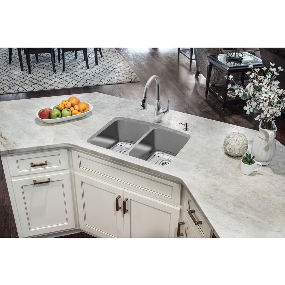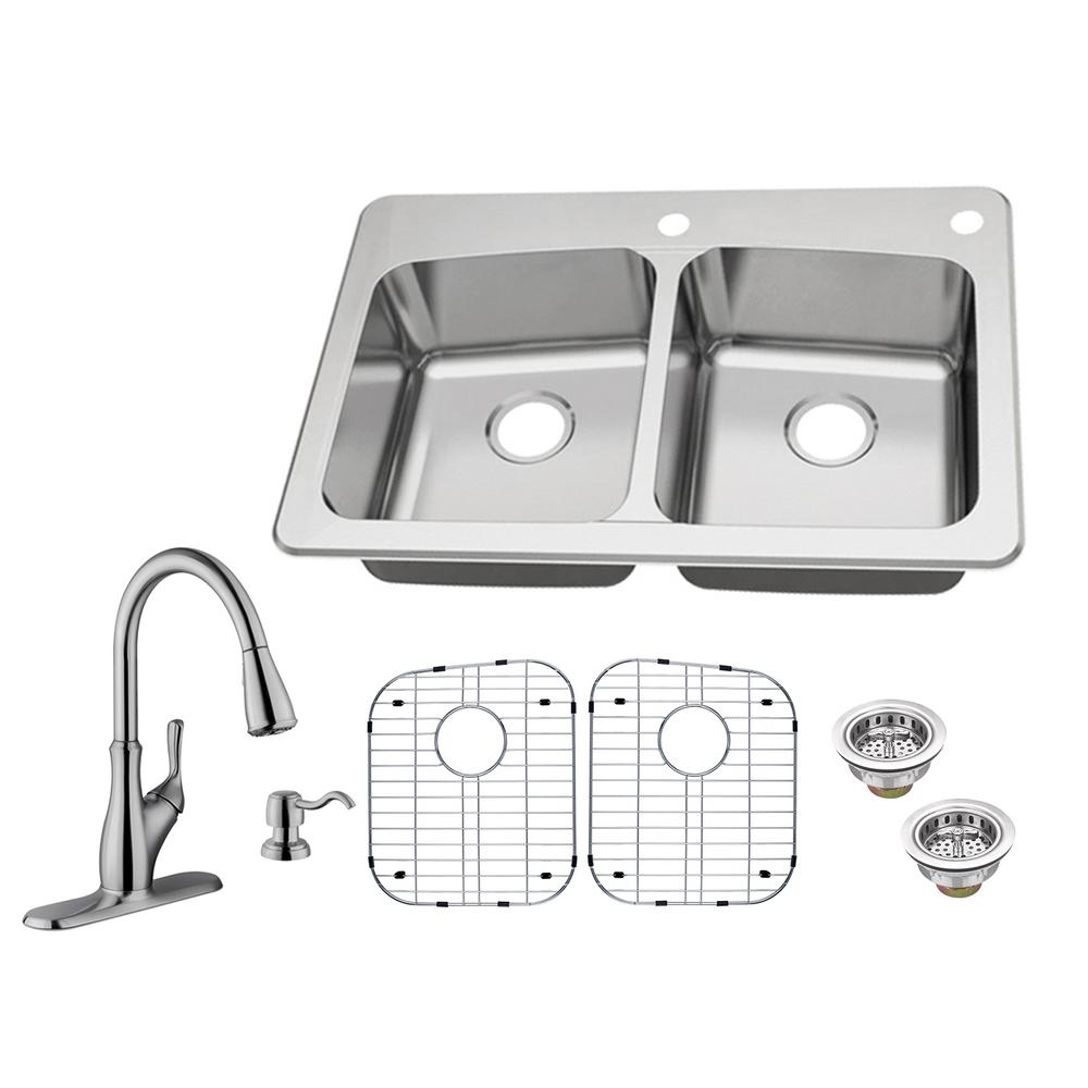 The double bowl format of this decorative kitchen sink allows for complete separation of clean and dirty dishes, conveniently dividing food prep from clean up. Dual mount design creates a versatile sink that can be installed in an undermount or drop-in format to suit specific kitchen dimensions and design preferences. Crafted from 18-Gauge stainless steel, the kitchen sinks brushed finish and lustrous metal composition gives the traditional dual mount format an industrial appearance.