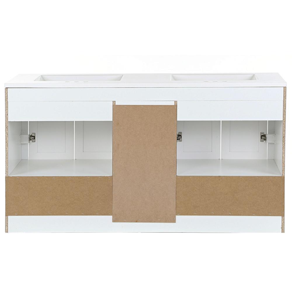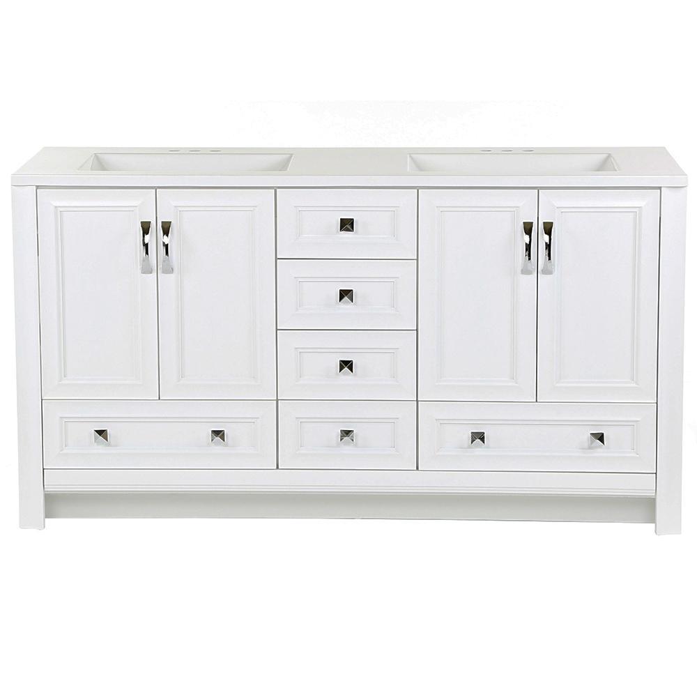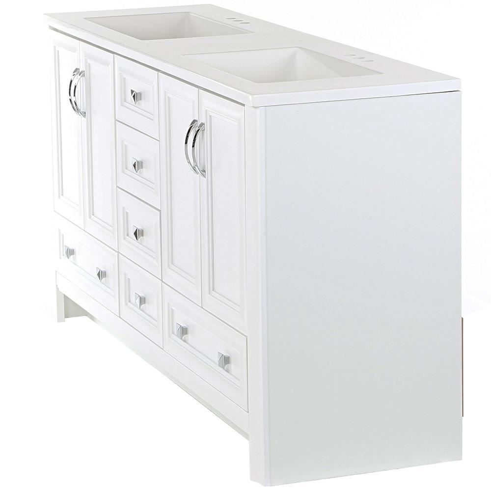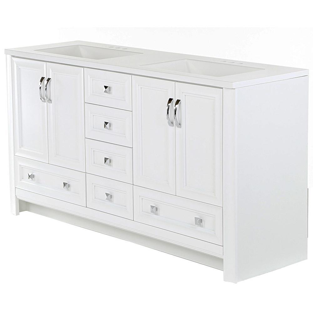 The 60.25 in. W Glacier Bay Candles by vanity in White with Cultured Marble vanity top in White is a captivating piece that displays a classic and contemporary feeling that will match any decor. The Candles by vanity cabinet features: a brilliant White finish and color matching furniture toe-kick, 4 centered and 2 lower end full extension drawers, and 4 decorative recessed paneled doors for maximum, and easy to access, storage. Complimented with a Solid White vanity top and accented with stylish, polished chrome cabinet hardware, the Candles by vanity is the ideal cabinet for the everyday home.