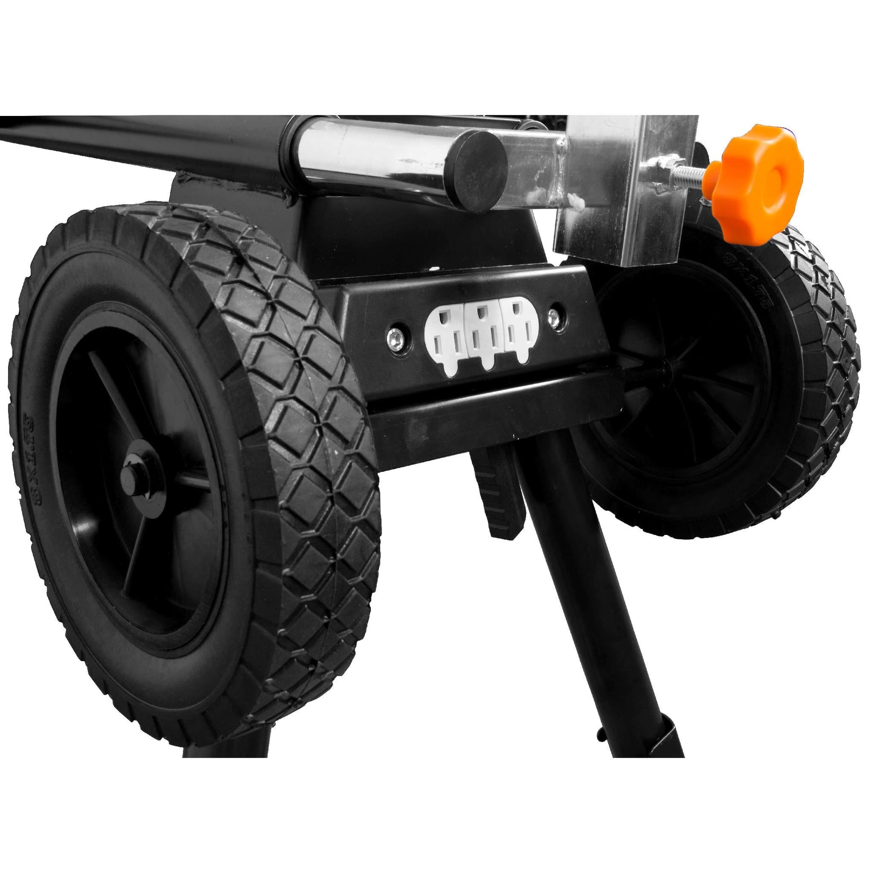 A heavy-duty, collapsible rolling stand that supports most miter saws and long workpieces. Built with a 1-1/2-inch diameter powder-coated steel frame, it features three onboard 15A outlets, extendable support arms, and 8-inch never-flat wheels for easy transport.