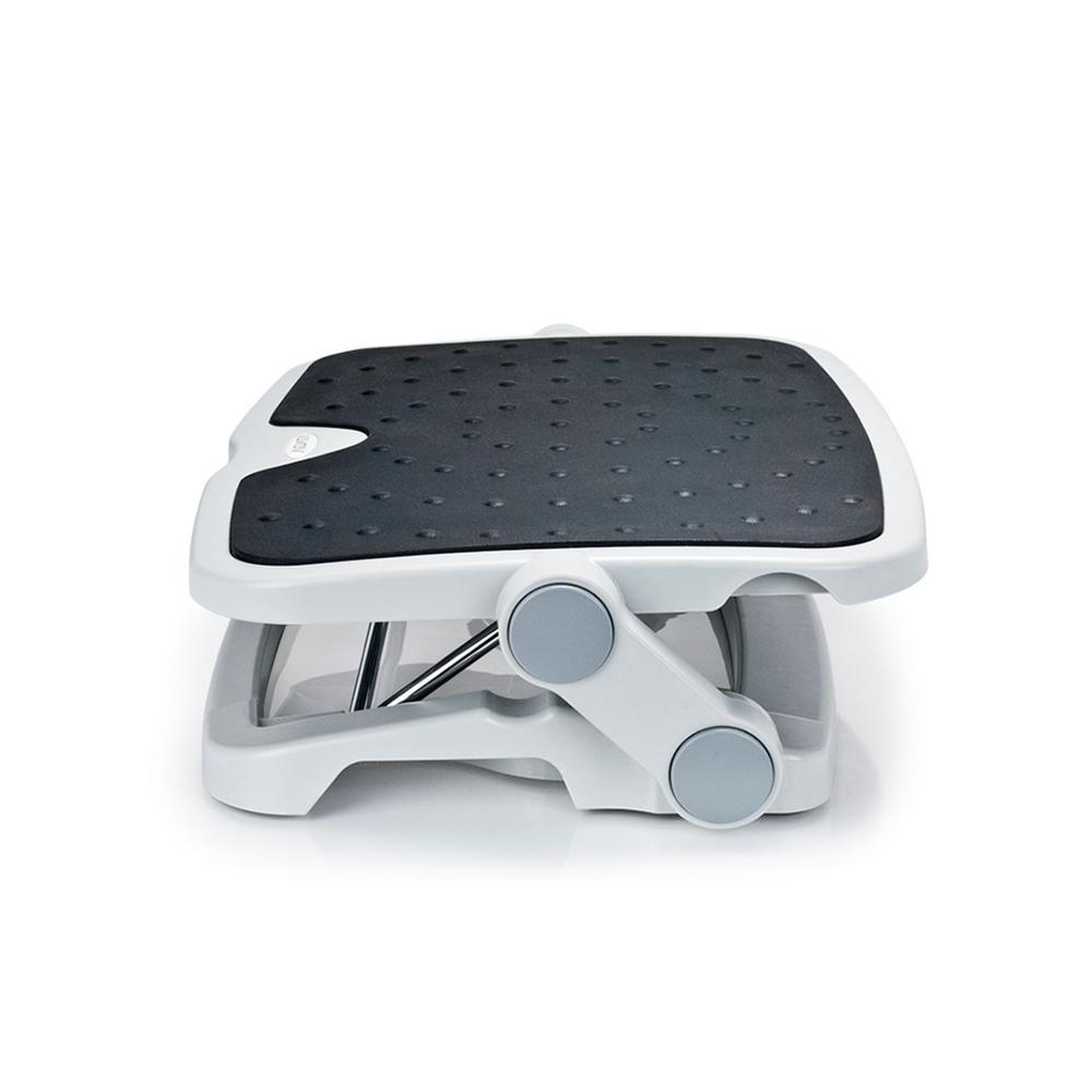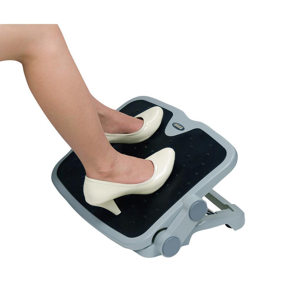 The Aidata Footrest is ergonomically designed to help maintain correct posture and reduce strain and fatigue while sitting. An elevated platform with 2 height adjustments lifts the feet to reduce pressure on the legs, which improves circulation and eases stress on your neck and back. Free tilting angle adjustment allows up to a 30 incline to keep your feet at the most comfortable angle while the free tilting motion itself promotes active feet to keep blood flowing. A large foot platform measuring 17.8 x 14 ensures both feet can remain comfortably flat and spaced. The high-impact plastic construction and rubber no-skid grips keep the entire footrest sturdy and in place during use. The Aidata footrest is the perfect accessory to keep your feet comfortably supported while reducing the risk of injury or other health issues caused by bad posture.
