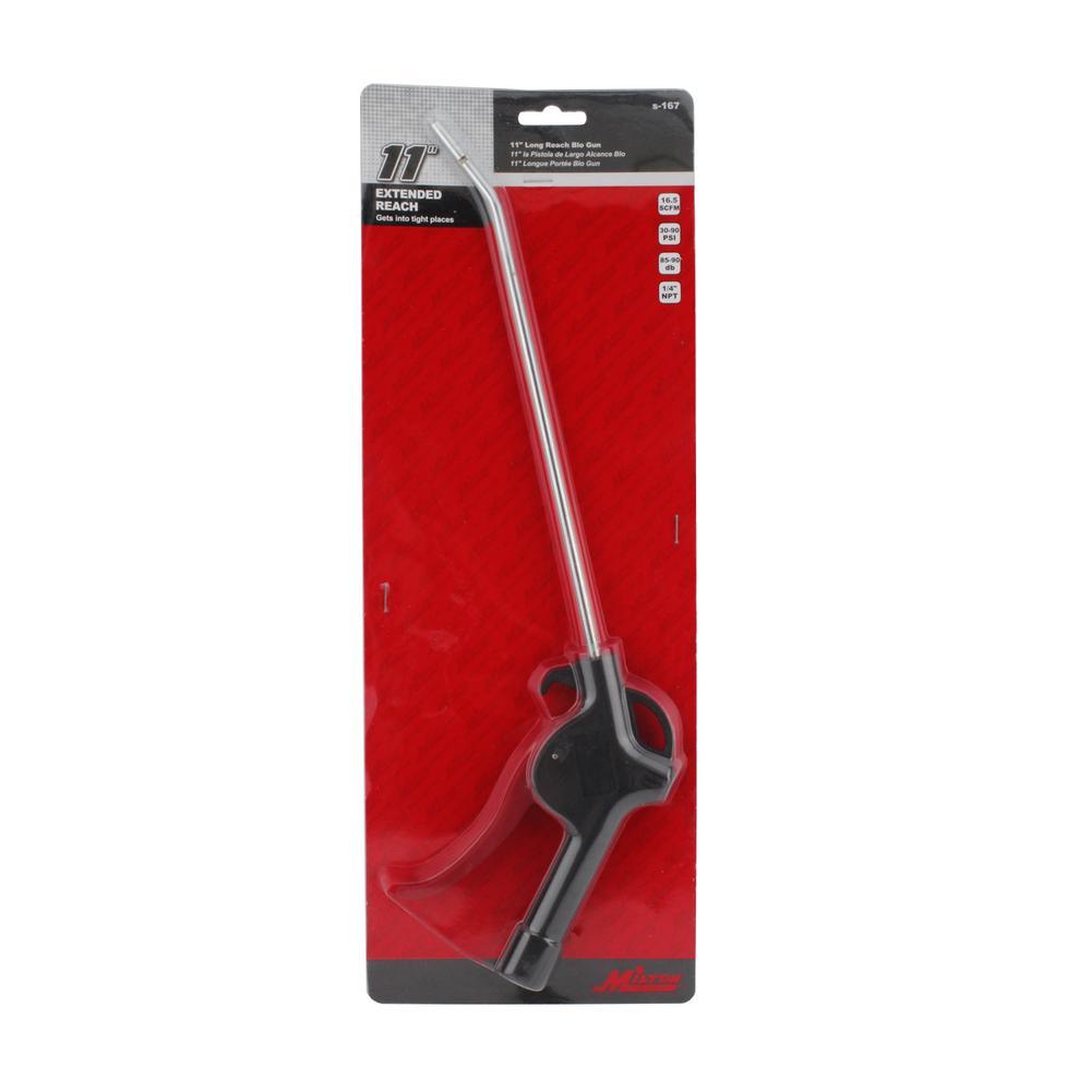 Take on those challenging narrow, tight spaces with Milton's S-167 10 in. Extended Reach Safety Tip Blow Gun. The 10 in. narrow, bent nozzle not only fits into tight spaces, it also comes with a side vent, making this product OSHA compliant. This pistol grip type body offers a molded comfort grip along with both an integrated hook as well as a hang hook for storage. 1/4 in. NPT brass air inlet offers a secure fit onto hoses. This blow gun offers a pressure range of 30 lbs. to 90 lbs./sq. in. and 16.5 SCFM. APPLICATIONS: Home garage, Pro auto shop, Industrial, Heavy-duty, Farming/Agricultural use and more. Long-reach, contoured grip, 10 in. extended angled safety nozzle OSHA-Compliant 1/4 in. national pipe thread brass air inlet 16.5 standard cubic feet per minute (SCFM)- 90 maximum psi Product dimensions: 15.5 in. x 3.88 in. x 0.88 in., Packaged dimensions: 16.5 in. x 6 in. x 0.88 in.