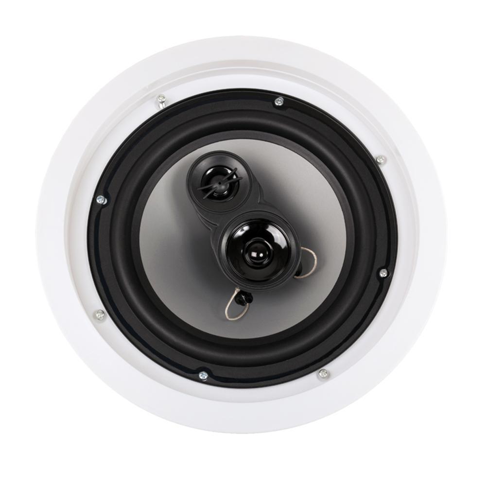 Acoustic Audio CSic83 Cinema Series 8 in. in-ceiling surround sound 3-way speakers are ideal for any home, office or entertainment area because they are designed with supreme performance in mind. Each speaker handles 350-Watt of power and includes: a 8 in. Poly cone woofer for improved motion and higher bass response, a butyl rubber surround, a progressive spider for greater control and higher excursion capabilities, a poly mica midrange, a 13 mm soft dome tweeter for detailed high frequencies and a 3-way passive crossover for greater fidelity. Spring loaded push terminals allow for easy connectivity and its low profile baffle housing was designed for simple installation and an improved frequency response. The white grill will coordinate well with any interior, or can be painted to match individual decor. Included is a cutout template to aid in the installation process and full instructions.