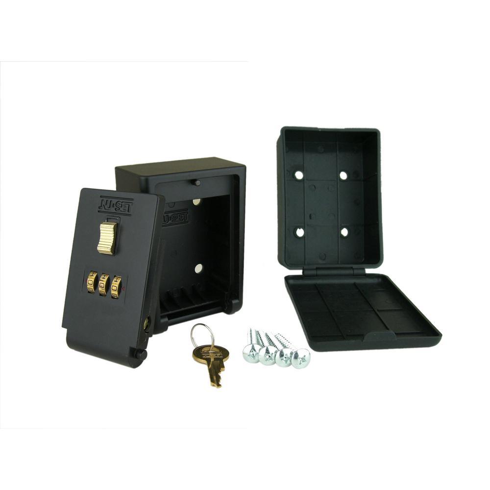 NUSET 2050 series 3 digit combination wall mount lock box with protective cover. Large vault allows for extra key storage. Protective weather case completely encloses the box for ultimate outdoor protection.