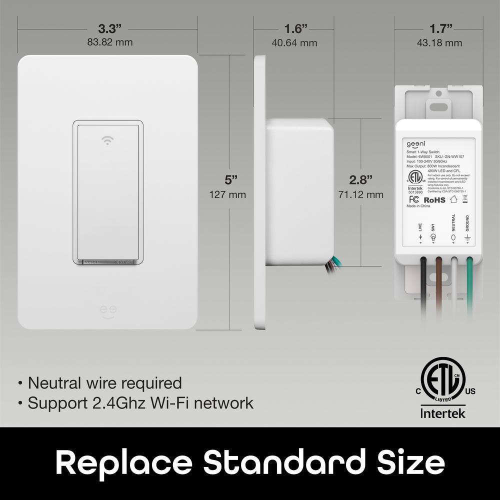 Whether your old switch controls a roomful of lights, chandeliers or a fan, replace it with the Geeni TAP Wi-Fi Smart Light Switch to control by touch, app or voice using Amazon Alexa, Microsoft Cortana or the Google Assistant. The smart switch installs as easily as a traditional light switch and connects to your home Wi-Fi in no time through the Geeni app. Using your home Wi-Fi, use 'Schedules' to set your smart light switch to automatically turn on and off while you're home or away. You can set your lights to turn on/off each day of the week at the scheduled times. This TAP smart light switch works with your home Wi-Fi—no hub required! Simply download the Geeni app, install your switch and connect. It also works with Amazon Alexa, Google Assistant and Microsoft Cortana. The Geeni TAP Smart Light Switch is only compatible with 2.4GHz Wi-Fi networks. For a safe installation, cut off power beforehand. These light switches work in a single-pole setup only and require a neutral wire to power the smart light switch. The Geeni app works with all Geeni smart home devices, allowing easy control of your home from your Android or iOS smartphone. Your home, One app for all. Geeni is the market leader of affordable and approachable smart home devices. Featured by Google, Microsoft, Amazon, CNET, The Wirecutter, The Verge, TechCrunch, ZDNet, TechHive, and more, the Geeni brand is at the vanguard of technology and features, but user-friendly enough for everyone.