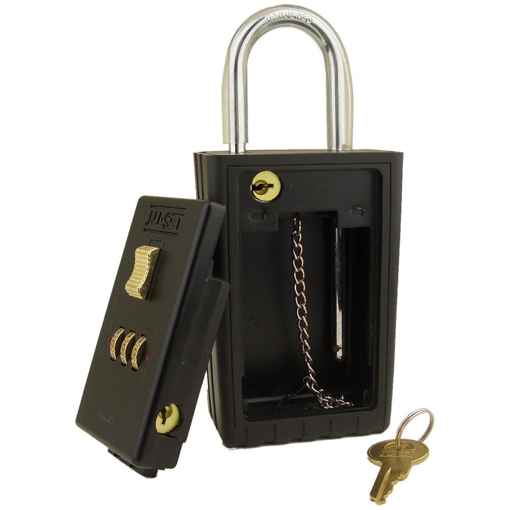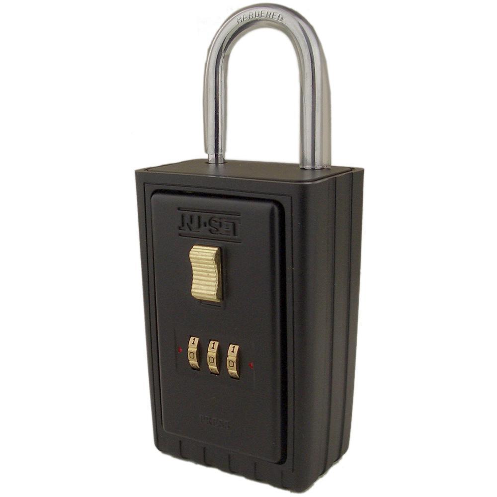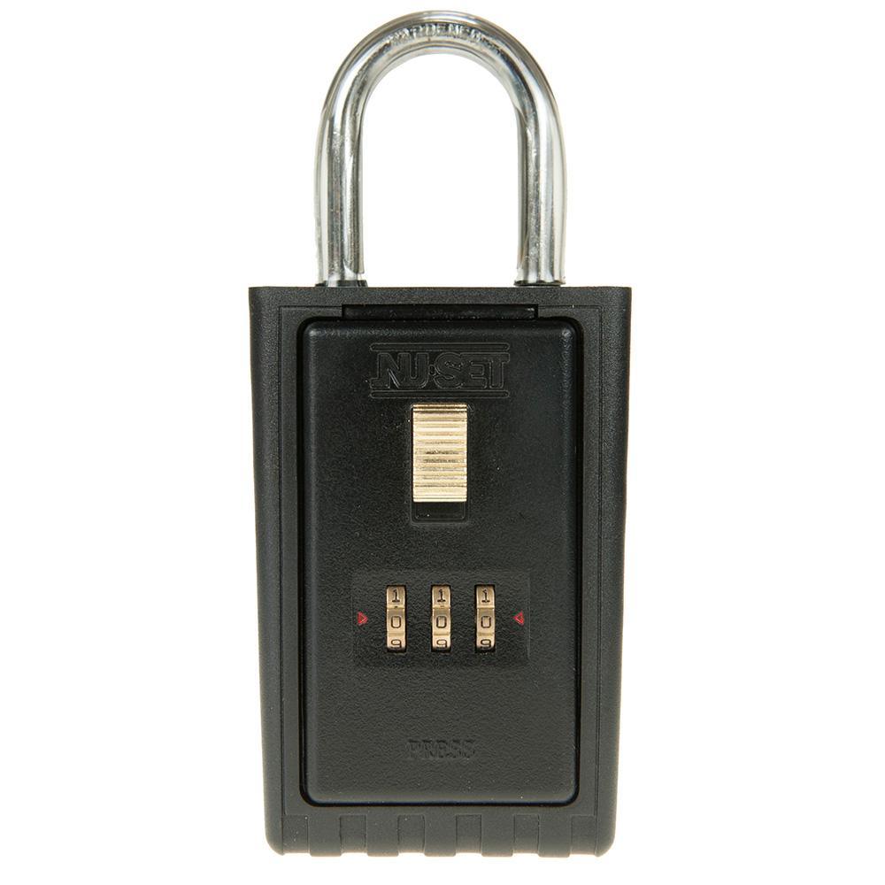 NUSET 2020 series 3 digit numeric combination lock box. Has key locking shackle for added security. Large vault capacity for multiple keys.