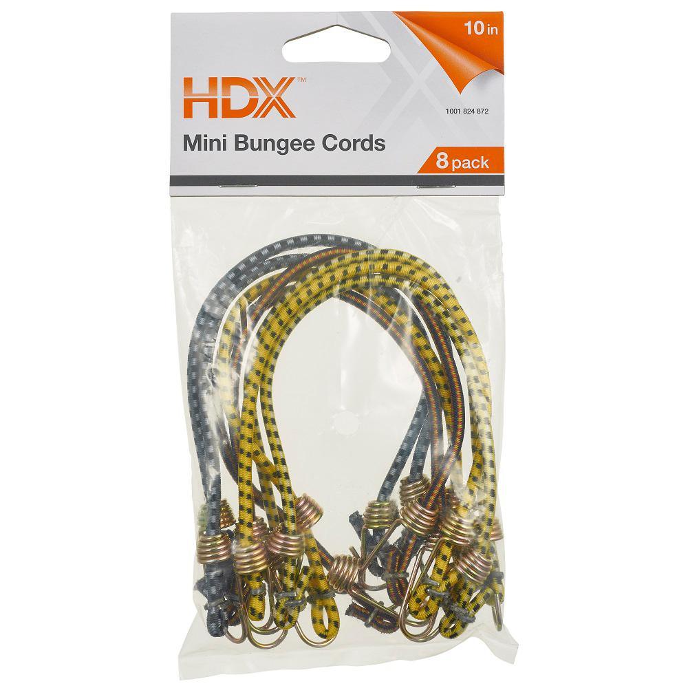 HDX 10 Mini Bungee Cords are manufactured from premium grade rubber delivering quality, durability and elasticity. The bungee cords feature bright colors and UV resistant woven outer-jackets to withstand the elements and repeated use. Ideal to use around the house, camping or on-the-go and for bundling small items.