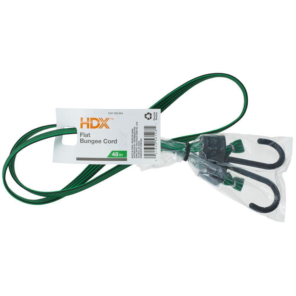 HDX 48 Flat Bungee Cord is fabricated from top quality rubber delivering convenience and reliability for all your cargo transport needs. The flat cord is designed to distribute load weight for efficiency and will not dig in to cargo. It features oversized coated steel hooks to protect from rust or marring and UV resistant woven outer-jackets to withstand the elements and repeated use.