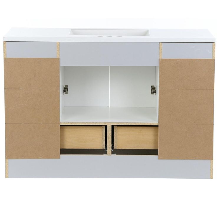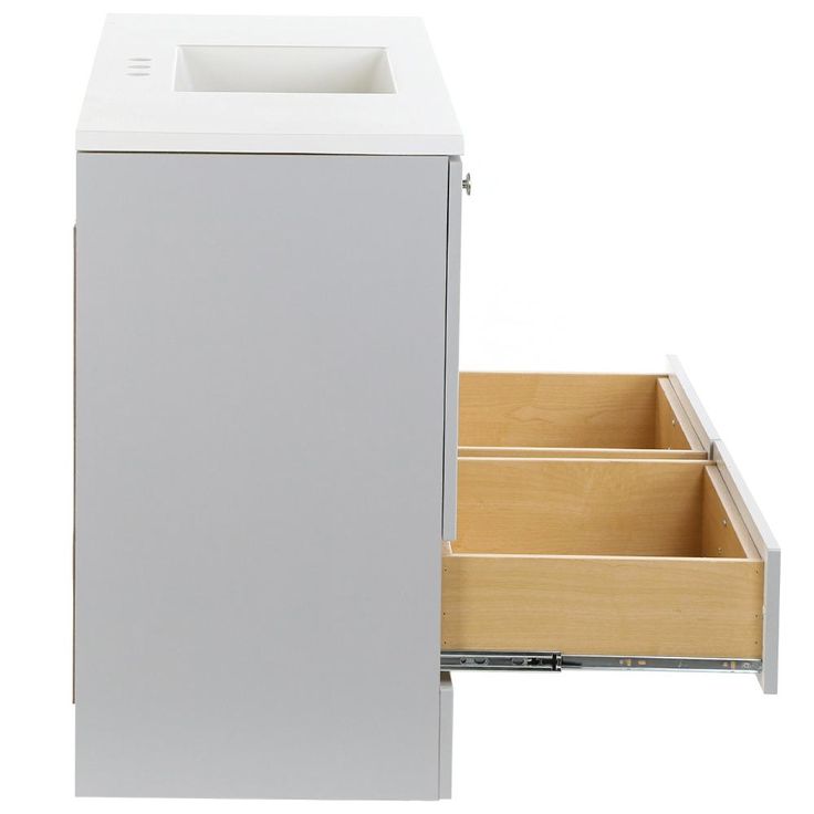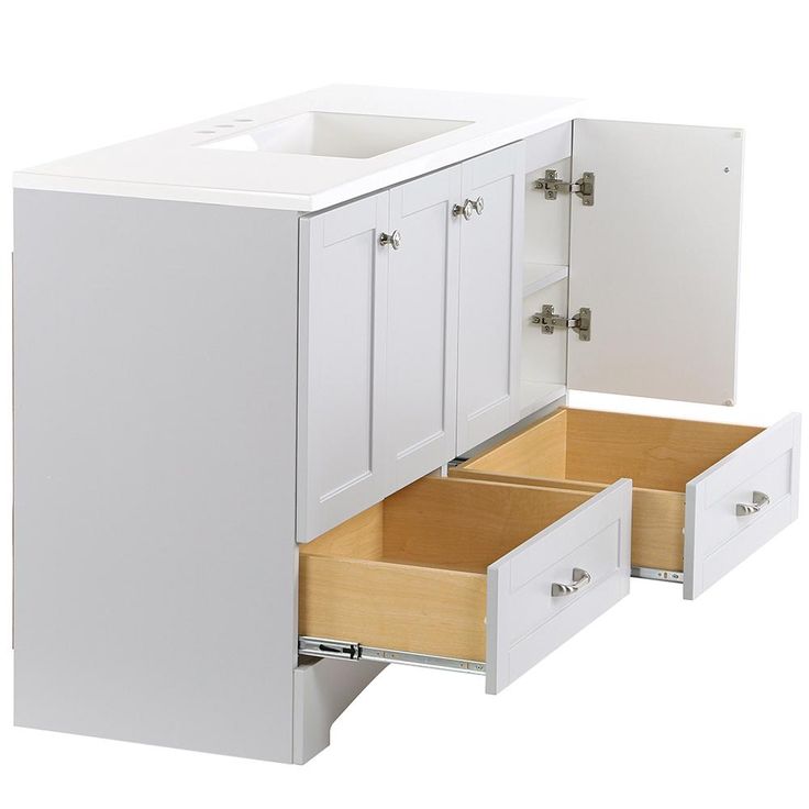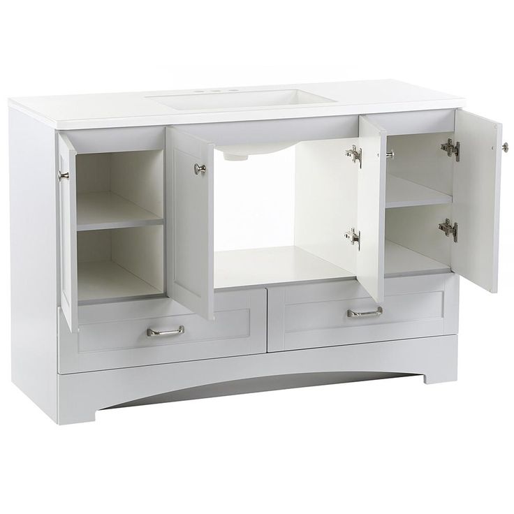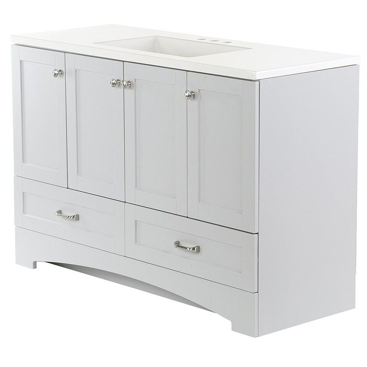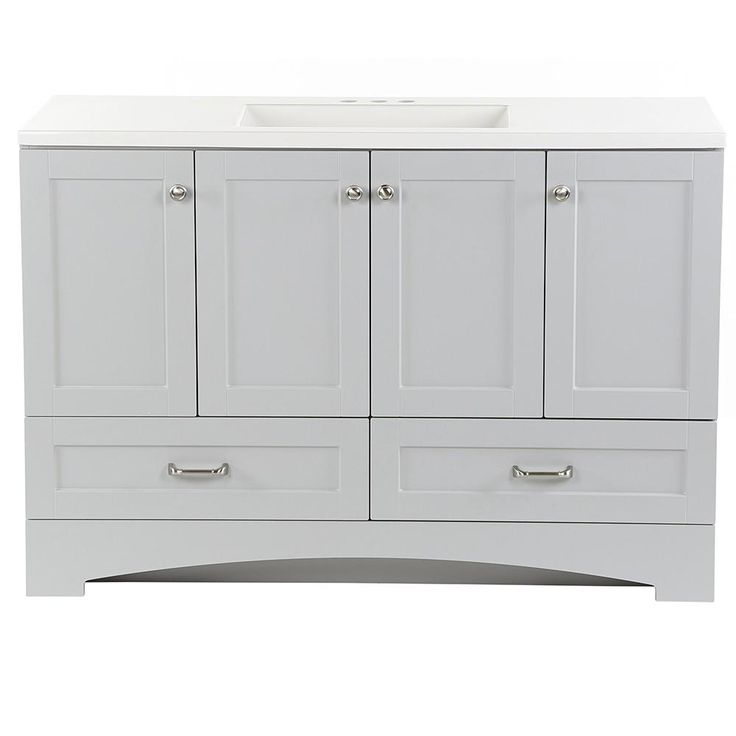 The Glacier Bay Lancaster 48 in. W Vanity in Pearl Gray with White vanity top has classic styling that will complement a wide variety of bath or powder room decor. Featuring a stunning Pearl Gray finish for a clean and fresh look, the vanity offers a white vanity top with an integrated rectangular sink while providing ample storage space for all your bath needs. Fully-assembled with an open back for quick and easy installation, this chic cabinet coordinates best with other Lancaster Collection pieces for that polished look that is simple to achieve and enjoy.