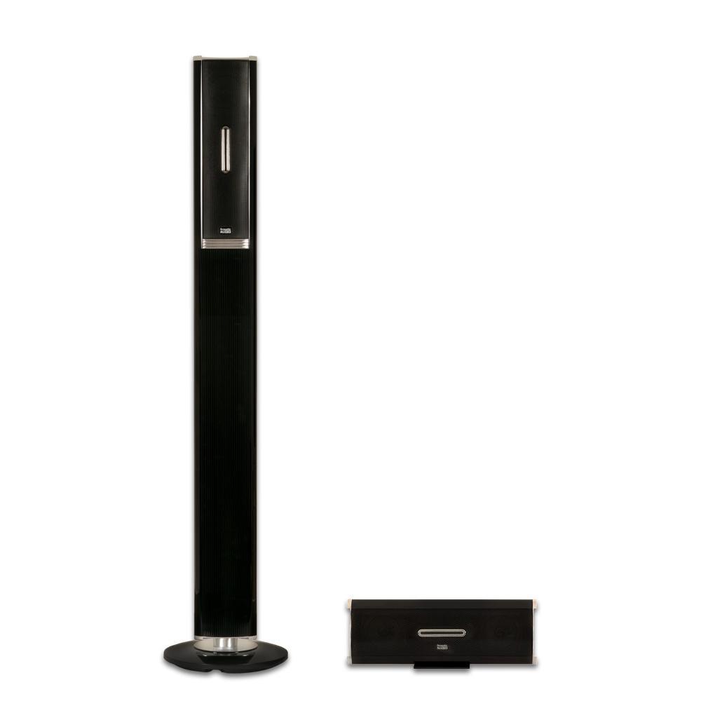 One 3-way bookshelf center speaker (H x W x D): 5 in. x 13.25 in. x 3 in., four 3-way tower speakers (H x W x D): 43.75 in. x 4.5 in. x 2.75 in. with 9 in. round bases