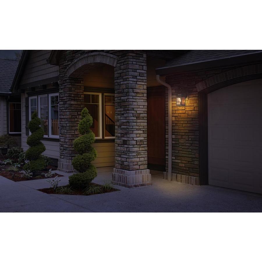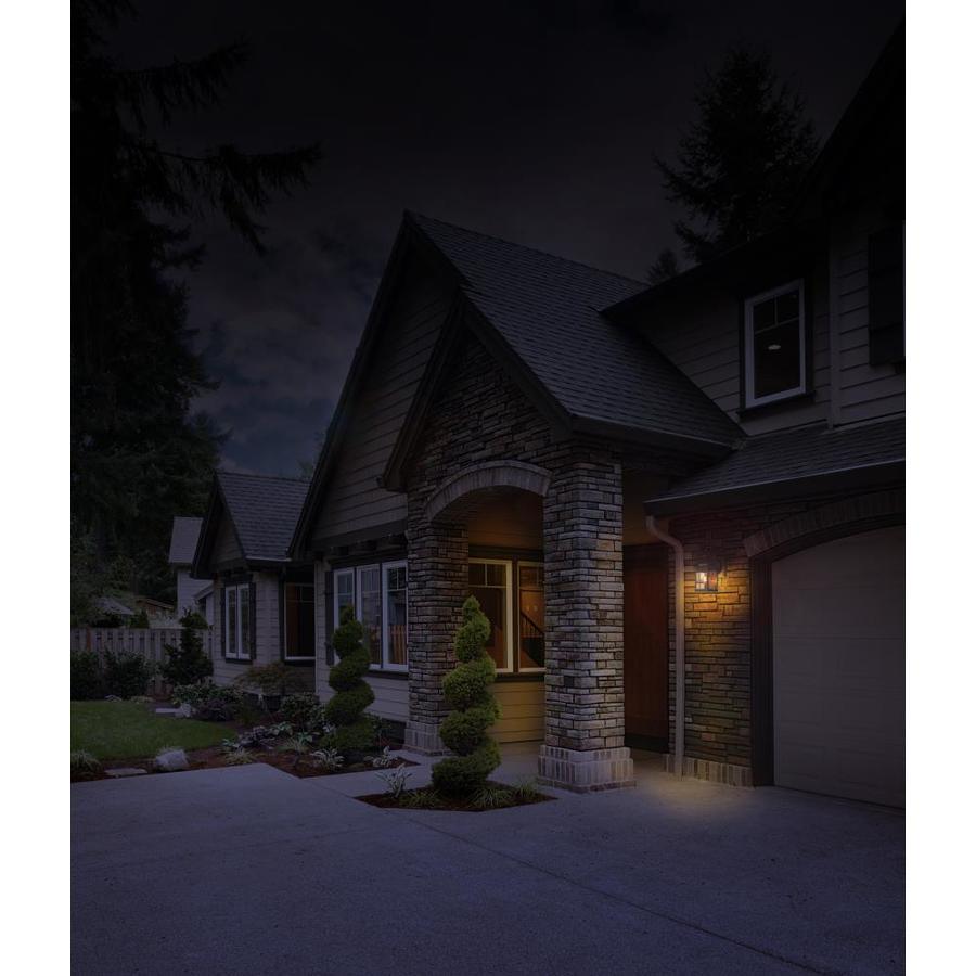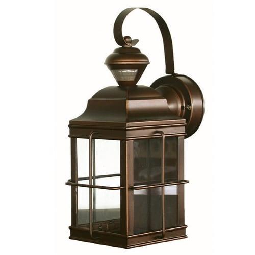 Antique bronze-finished steel fixture with flat glass is weather-resistant and sturdy 100 watt medium base incandescent Bulb required (not included) 150 ° Motion-activated sensor detects movement, automatically turning the light on 6.75-in W x 14.75-in H x 8.5-in D 2-year base warranty on the parts gives you peace of mind UL/cUL and CSA safety listing demonstrate this product has met minimum requirements of widely accepted product safety standards Hardware included for easy setup Ideal for entranceway lighting