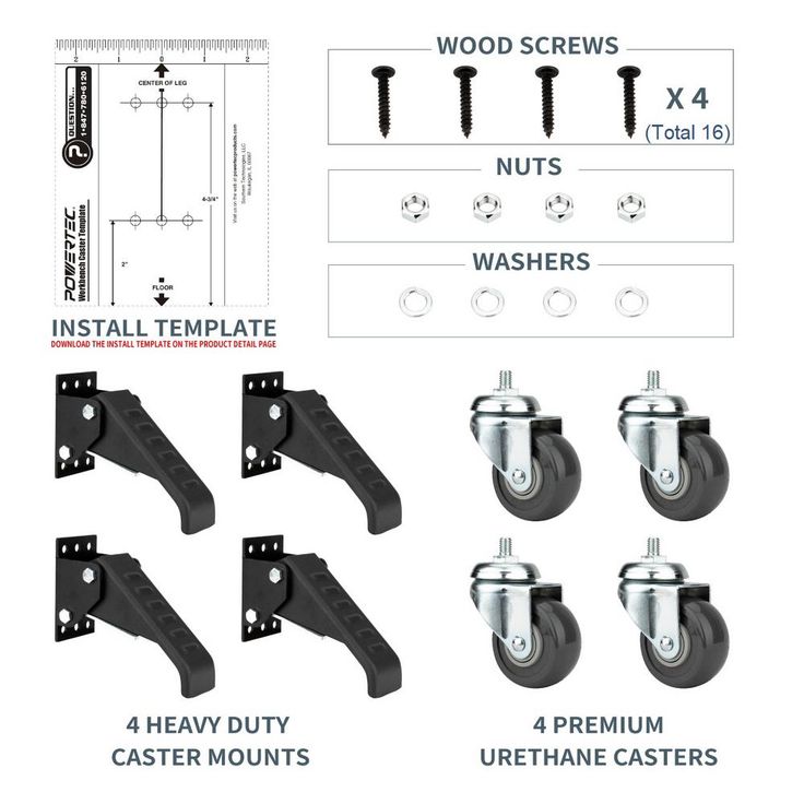 The POWERTEC 17001 Workbench Caster 4-pack Kit with Multiple Mounting Options is the perfect solution for positioning your heavy workbench to any desired area in your shop. By simply pressing the foot pedal, you can elevate your workbench off the floor (3/4 in.) and effortlessly move it to any desired location. When ideally placed, just lift up the foot pedal and lower table firmly back onto the floor for grounded stability, it is that easy. Constructed of durable carbon steel, these casters shoulder the weight so you do not have to. Each 2-3/8 in. polyurethane caster can support 100 lbs. (400 lbs. combined capacity) and offers a non-marring, smooth rolling action. Experience ease of movement with the caster's 360° pivoting action. 6 predrilled holes offer secure and hassle-free installation while allowing for multiple mounting options. The added mounting holes allow for a more secure and custom caster installation, a convenient advantage over other similar casters. All mounting hardware included.