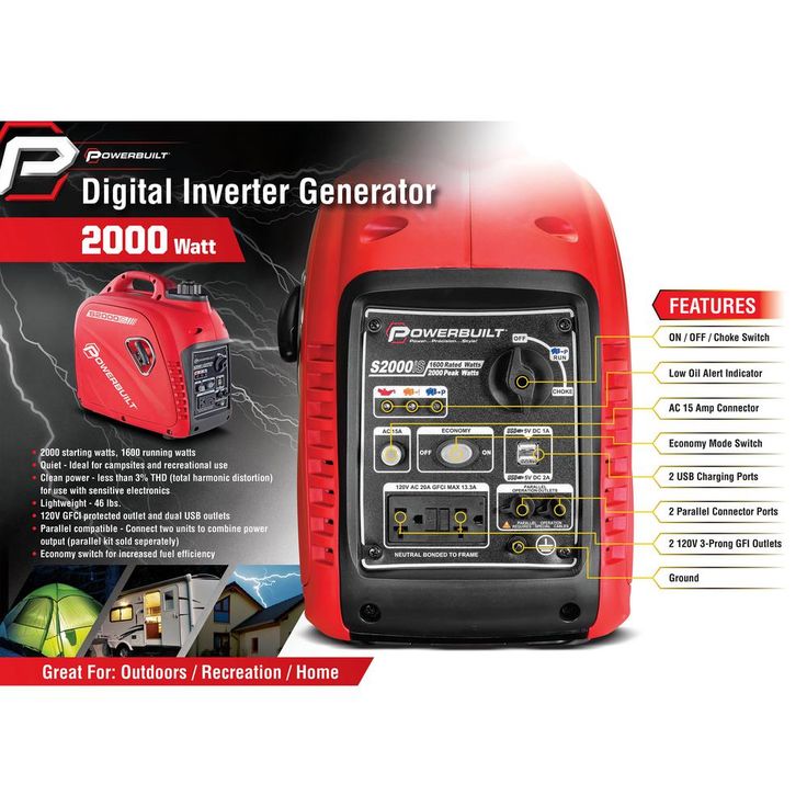 Regular price $540.23The Powerbuilt 2000-Watt Portable Inverter Generator is a quiet, powerful companion for camping, tailgating, hunting, parks, beaches and road trips. Fire it up anytime you need a boost of portable power that won't break your back to carry or bother the neighbors with noise. There's 2000 surge watts and 1600 running watts on tap, That's enough to power a TV, DVD player, satellite, small appliances and power tools. You spend less time refilling the gas tank too, with up to 12-hour run-time at 25% load. Count on easy starts on the first or second pull too. 2 GFCI 120-Volt outlets and dual USB outlets provide ample connections. and with Total Harmonic Distortion (THD) less than 3%, you can safely power laptops and other sensitive electronics.