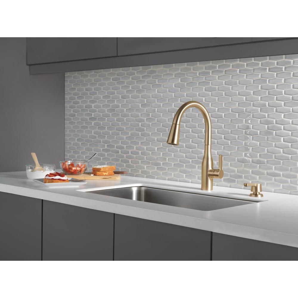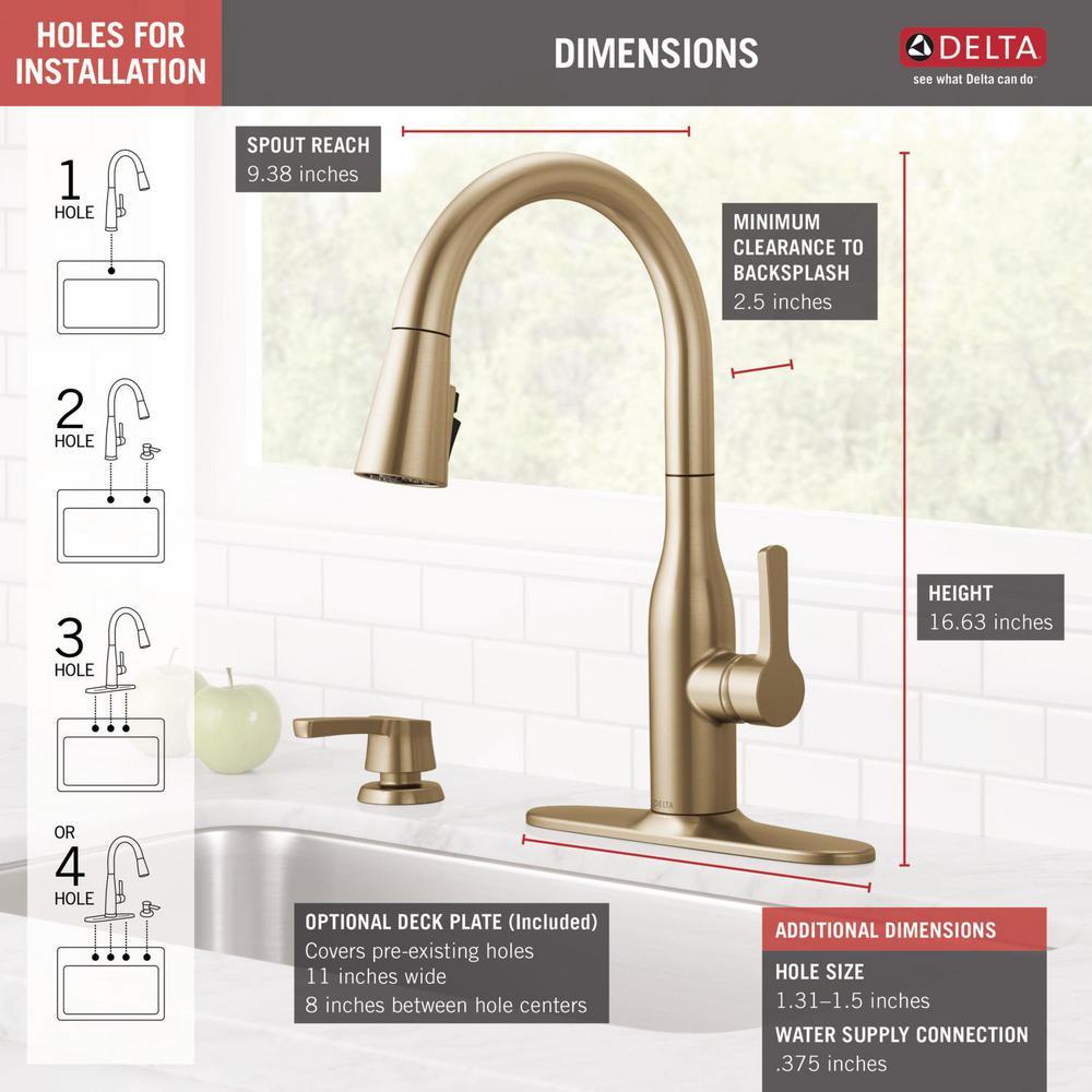 Delta MagnaTite Docking uses a powerful integrated magnet to pull your faucet spray wand precisely into place and hold it there so it stays docked when not in use. Delta ShieldSpray Technology cleans with laser-like precision while containing mess and splatter. A concentrated jet powers away stubborn messes while an innovative shield of water contains splatter and clears off the mess, so you can spend less time soaking, scrubbing, and shirt swapping. Delta faucets with DIAMOND Seal Technology perform like new for life with a patented design which reduces leak points, is less hassle to install and lasts twice as long as the industry standard. Kitchen faucets with Touch-Clean Spray Holes allow you to easily wipe away calcium and lime build-up with the touch of a finger. You can install with confidence, knowing that Delta faucets are backed by our Lifetime Limited Warranty. Industry standard is based on ASME A112.18.1 of 500,000 cycles.
