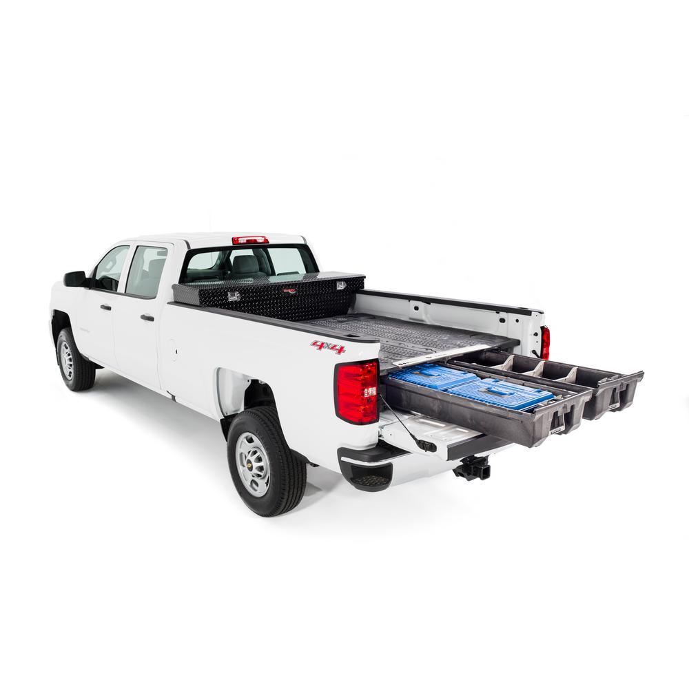 DECKED revolutionized Pickup Truck Bed Storage with a low-profile truck bed tool box system that is compatible with Ford, Dodge RAM, Chevy, GMC, Nissan and Toyota full-size trucks. 2 full bed-length drawers offer dry, secure storage with ergonomic access for tools, gear, guns, fishing rods and other items that slide out at waist height, while still allowing the owner full use of their truck or van bed. DECKED has a 2,000 lb. payload on the deck and 200 lbs. per drawer load capacity. Covered by 3-year warranty against product defects or failure due to workmanship. Further organization and customization is possible with optional nesting storage boxes, drawer dividers, tie downs and locks. DECKED Storage Systems are easy to install or remove, weatherproof, secure, and ergonomic. With a low-profile design the DECKED Storage System leaves plenty of room for further upfitting. DECKED Truck Storage Systems are perfect for small businesses like painters, carpenters, plumbers and handyman services. DECKED Storage Systems were also designed with the outdoors enthusiast in mind, allowing you to carry fishing, hunting or any kind of sports gear you can imagine. Note: drawers are not water or airtight, some fine particulate matter such as dust and water vapor may enter. Assembly and installation time approximately 2 hours. Removal/reinstall time approximately 15-20 minutes.