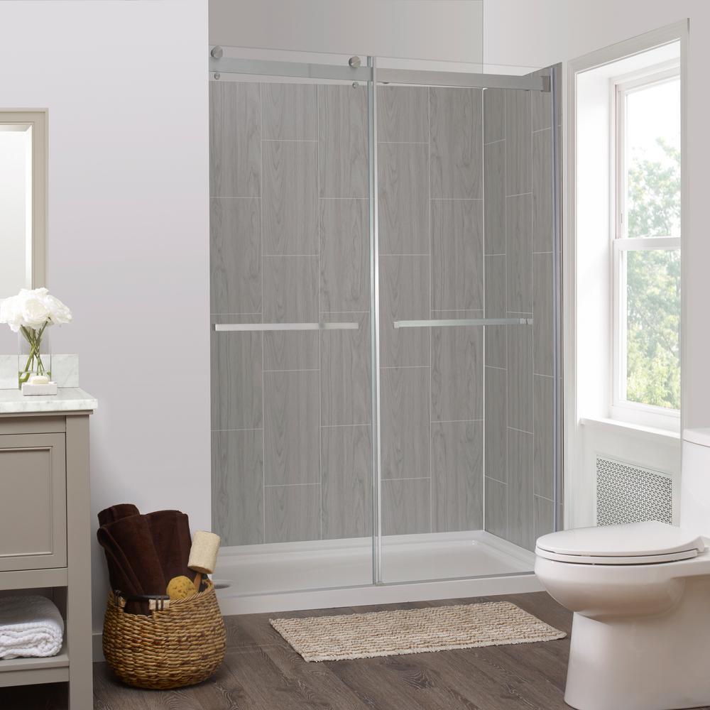 Update your bathroom with the Jetcoat® Shower Wall Kit, complete with Ash Grey 5-piece shower walls and a white 60 in. x 30 in. shower base and Lagoon Silver shower door. Easy to install, the Jetcoat® Shower Wall System is a Grout-Free Solution that can be installed over waterproof backer board or existing tile. It only takes a few hours to measure, cut, and adhere to the wall, which makes this a perfect DIY project for most. The Lagoon doors are constructed with 5/16 in. thick glass and prominent rollers that easily glide across a fully frameless design. H2OFF Clean Glass Technology is applied to the inside surface of the glass, providing a water repellant and stain resistant coating for superior protection and easy maintenance. Shower bases are made of high gloss white acrylic, making them easy to clean, and resistant to scratches and stains. The low, easy to step over threshold base comes standard with a slip resistant floor. Shower bases are easy to install, and when paired with the beautiful Jetcoat® Wall System, you will never find an easier or more affordable way to give your bath the stylish and dramatic makeover you've been dreaming of.