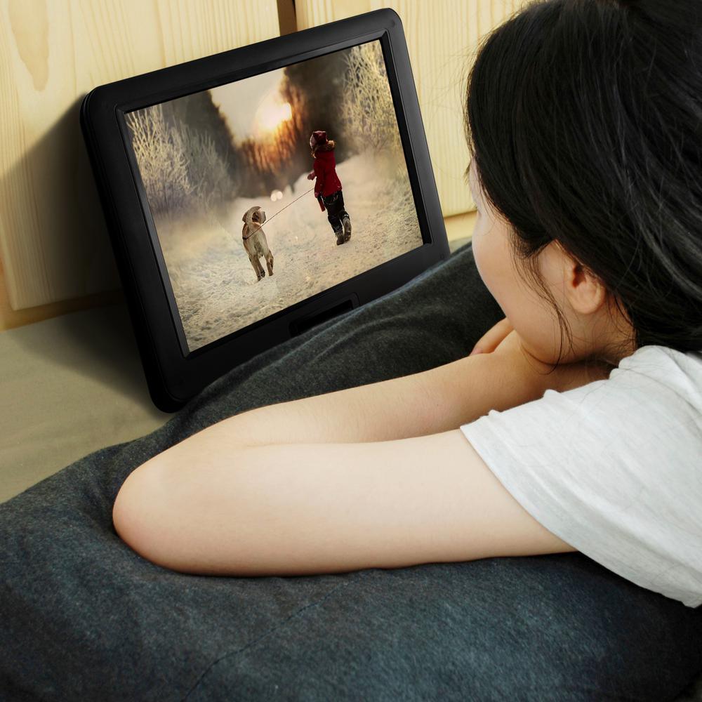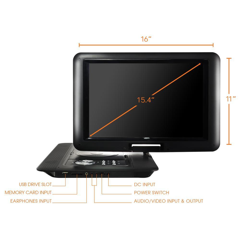 Enjoy your movies and other digital files on the go with this portable DVD player. Easily connect it to a television or take it with you wherever you wish thanks to its long-lasting rechargeable battery. The TFT high resolution screen swivels 270° and tilts 180° for perfect enjoyment at any angle. The wide 15.4 in. display ensures clear and beautiful images. It supports several formats, so you can enjoy a plethora of different files, whether on a flash drive, memory card or disc.