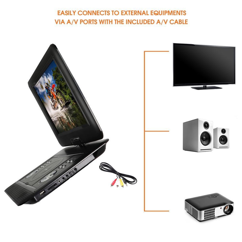 Portable DVD player provides a 90° rotation to the left and a 180° rotation the right