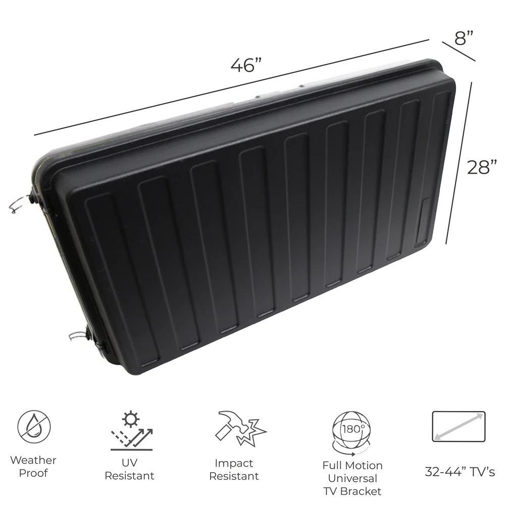 The Storm Shell Outdoor Hard Shell TV Cover with TV Wall Mount Bracket is the perfect solution for protecting your outdoor TV. It is rated for a 32 - 44 in. Flat Screen TV. It's Waterproof and Impact Resistant Storage. It also has a Full Motion Articulating Arm for Viewing. It includes a 2 piece hard shell ABS plastic TV cover. It fits most flat screen TVs from 32 in. to 44 in. (diagonal screen). This product is UV resistant, waterproof and impact resistant. It comes with lockable buckle latches (lock not included). The front cover is fully removable for unimpeded viewing and sound from your TV. The TV wall mount bracket is built from solid, heavy gauge steel with a durable coated finish. This is suitable for installation on brick, concrete or wood studs spaced at 16 in. overlaid by sheetrock, stucco or siding. The TV Wall Mount is full motion articulating with +5°/-15° tilt and +/- 180° swivel. It accommodates various VESA mounting patterns including 200 mm x 200 mm, 400 mm x 400 mm, 600 mm x 400 mm. The maximum depth TV 4 in. The maximum TV weight capacity is 66 lbs. This includes a TV wall mount bracket, standard assembly mounting hardware and installation instructions.