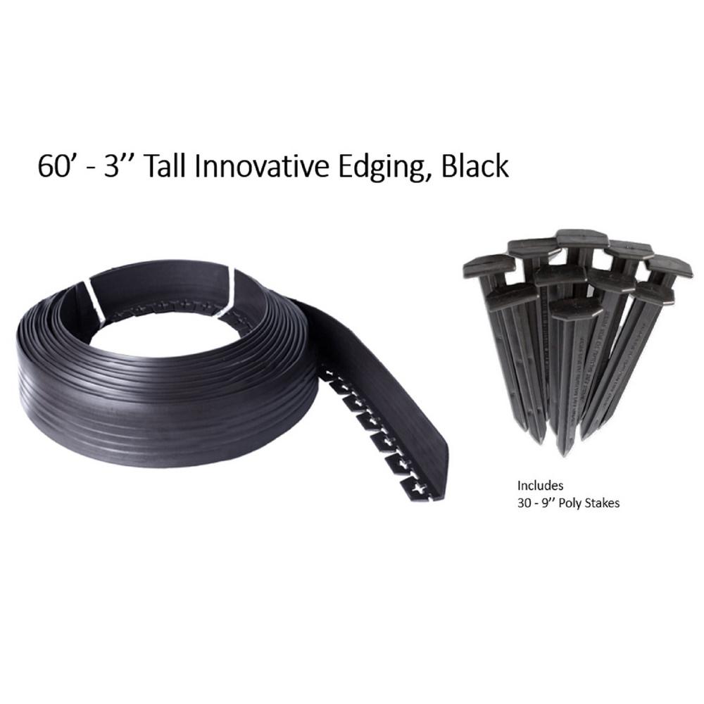 20 ft. of TALL Innovative edging in black has many benefits to a landscape design. The 3 in. H allows for more bedding material, stone/mulch than the shorter height no dig edgings in the industry. The edging can be contoured to create curve or straight designs. No digging for installation unless you prefer to have the sidewall lowered in your design. Easily cut to length by use of tin snip or a hack saw. Wear protective gloves before cutting. Perfect for long driveways, sidewalks and ringing trees. Landscape fabric can be installed up to the sidewall and using any of the suppliedheavy-dutypoly anchor stakes to secure. 10heavy-dutyanchor stakes provided with each coil.
