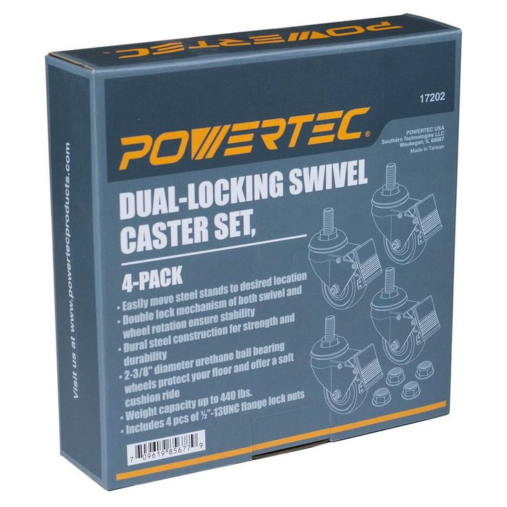 Introducing the 2 -3/8 Dual Locking Swivel Caster Wheels by POWERTEC . An impressive combination of precision and heavy duty craftsmanship, these heavy duty steel casters are conveniently paired with (PU) polyurethane wheels. Each wheel was designed with dual locking action, intended to add exceptional stability for material handling, along with braking versatility for an assortment of mobilized applications. The free-pivoting swivel mechanism ensures a proper 360 rotation, providing optimal control and maneuverability to turn tight corners. Each caster wheel flaunts an impressive 100 lb. loading capacity perfect for an assortment of mid-tier to heavy lifting jobs. This simply means, with this 4 piece set, you ll already be starting out with 400 lbs. of smooth rolling. The non-marring wheels protect your floor and offer a soft cushion ride. The foot pedal mechanism is foot-activated and features a rugged steel construction with a premium polished silver finish. Additionally, the high precision ball bearings offer exceptional noise reduction, decreased rolling resistance and consistent hauling. The set includes threaded flange lock nuts for an easy installation. Commonly Used Applications Mobile Work Tables Drum Sanders Workbenches Industrial Equipment Carts Mobilized Dust Collectors more!