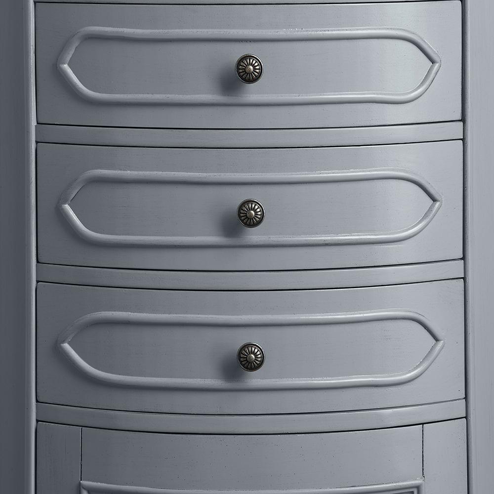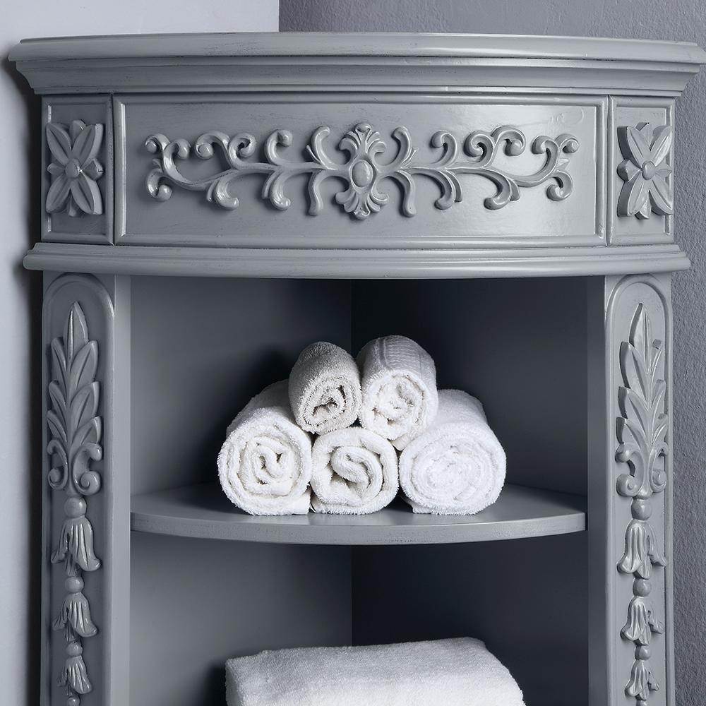 Our elegant Winslow Corner Linen Cabinet will bring traditional beauty to your bath. Nestle it into a corner to add just the additional storage you need with its open shelves, drawers and lower cabinet. This corner bath cabinet boasts elegant molding, embossed motifs, cabriole legs and ornate hardware in an antique finish.