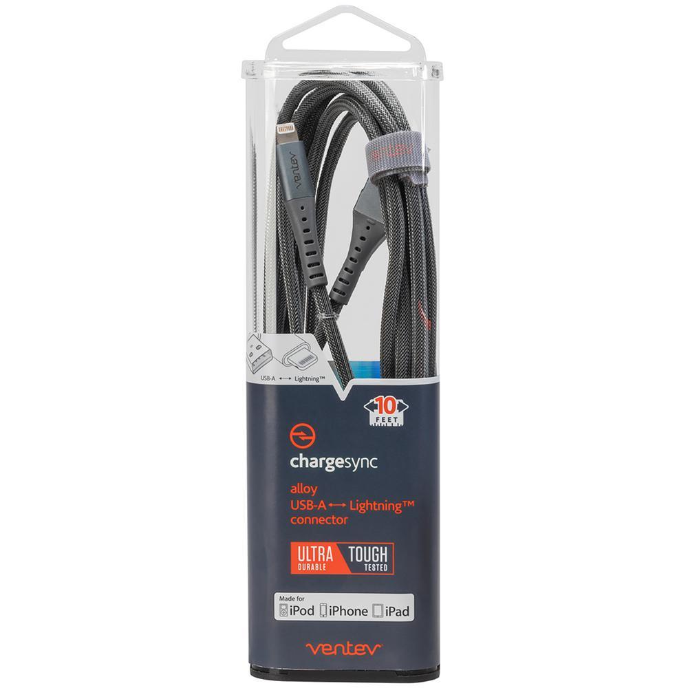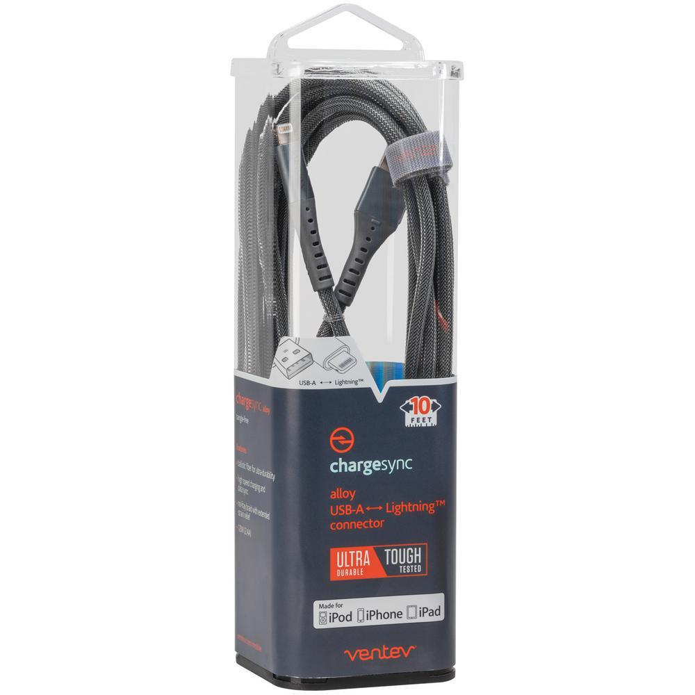 These 10 ft. Chargesync Alloy Cables Last Longer And Stand Up Against The Toughest Situations. An Ultra-sleek Brushed Aluminum Housing, Oversized Strain Relief, And Braided High-tensile Wrap Provide A Premium Finish And no-fray Durability. This 10 ft. Cable Goes One Step Further With An Enhanced Strain-relief-reinforced Construction. Apple Lightning Cables Support Up To 2.4 Amp And Available In Steel Gray. All Cables Include A Wrap For Easy Cable Management. Mfi Compliant. Limited Lifetime Warranty.