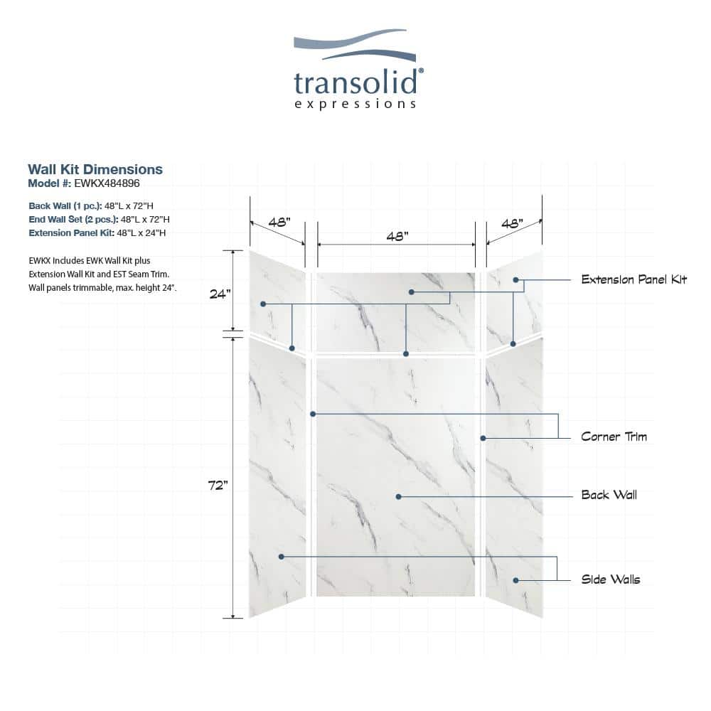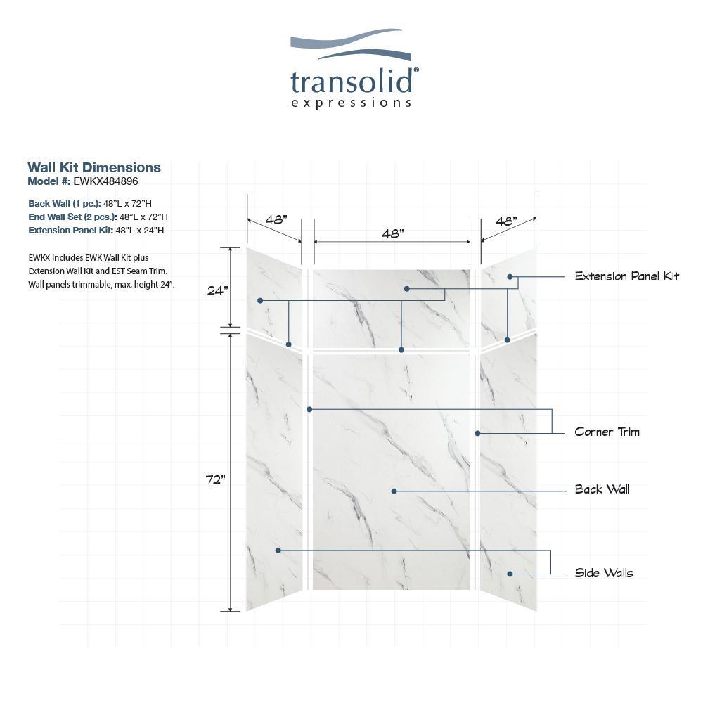 3 main wall panels (back 48 in x 72 in; 2 side walls 48 in x 72 in), 24-in extension wall kit with seam trim, 2 inside corner trim pieces, color-matched silicone adhesive