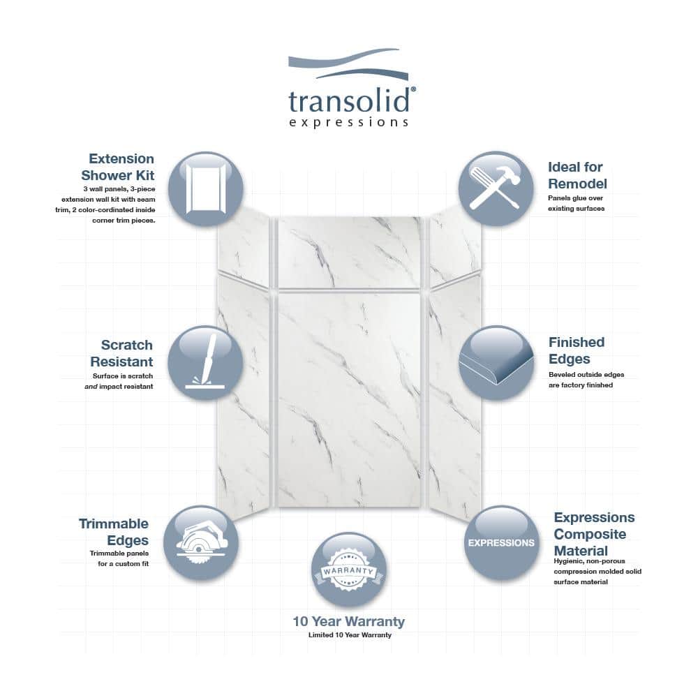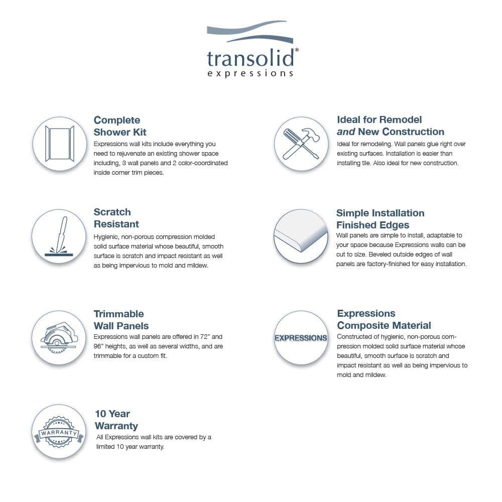 Upgrade your alcove shower with Transolid’s Expressions solid-surface wall surround. The non-porous composite panels glue over existing surfaces for a fast remodel, feature factory-finished edges, and include an extension kit to reach 96 in. height.
