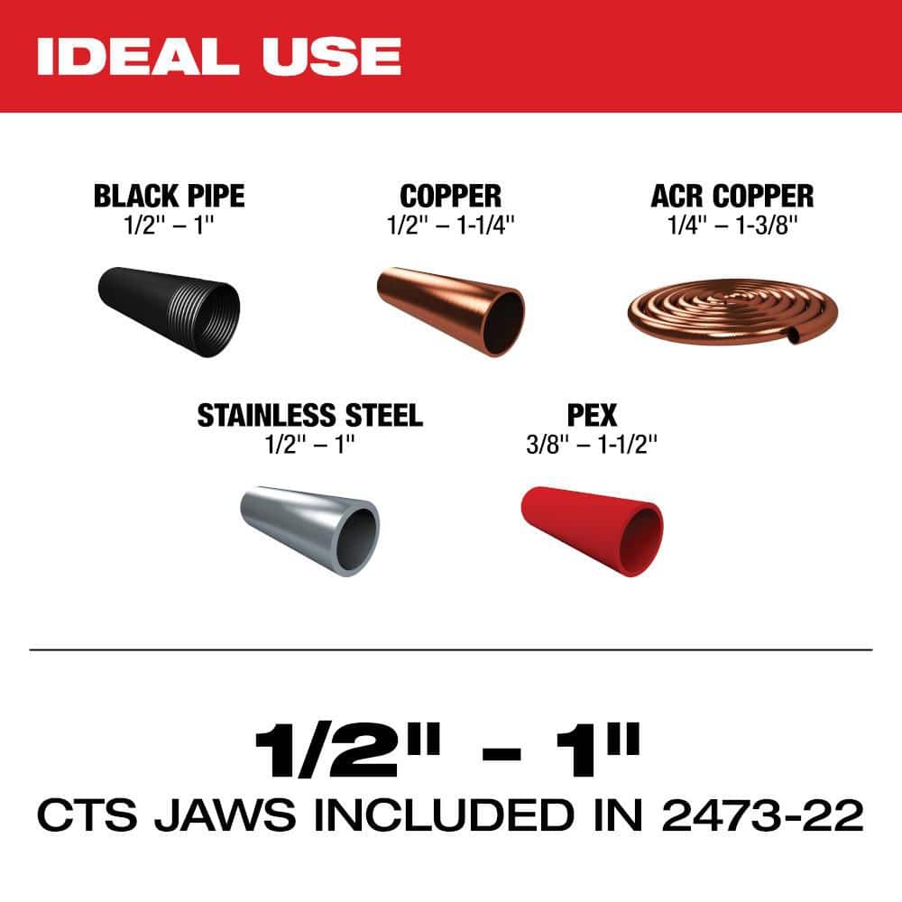 Complete Kit: Includes 1/2 in., 3/4 in., 1 in. jaws, two M12 batteries, charger, case, and free M12 copper tubing cutter (2471-20)