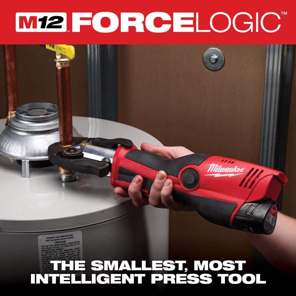 This Milwaukee M12 FORCE LOGIC cordless press tool kit delivers compact, one-handed pressing for copper, PEX, stainless, and black iron systems. It includes 1/2 in., 3/4 in., and 1 in. jaws, two M12 REDLITHIUM batteries, charger, carrying case, and a free M12 Copper Tubing Cutter for fast, clean cuts.