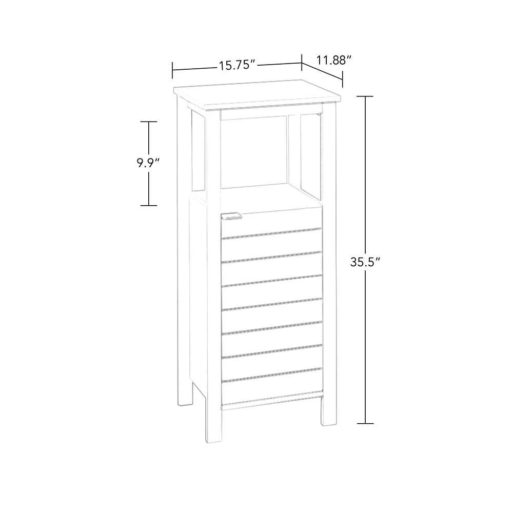 Narrow, yet spacious, design allows for stylish storage in a compact area. The RiverRidge Madison Collection Single Door Floor Cabinet features open shelves above and adjustable shelves behind cabinet door below. Perfect for storing towels, wash cloths, soaps and small bathroom necessities. Additional dimensions are: Top of Cabinet: 15.75W x 11.88D, Open Shelf: 12.75W x 10.88D x 9.88H, Interior Shelf: 11.75W x 10.88D, Space Between Interior Shelves: Adjustable.