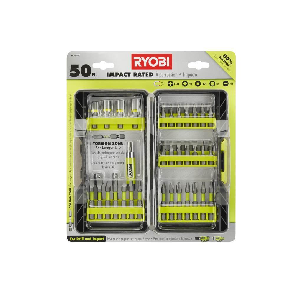 RYOBI Impact Rated Driving Bits are built to withstand the tough demand that comes with the use of an impact driver. The 2 in. bits feature a TORSION ZONE that is engineered to absorb the high torque and demand that comes with the use of an impact driver. This 50-piece kit offers a variety of the most commonly used 1 in. and 2 in. bits, along with specialty socket adaptors, nut drivers and magnetic screw guide. The included case is compact and modular, meaning the bit holders can be removed or rearranged. This allows for complete customization of accessory kits. For more things RYOBI, visit RYOBItools.com.