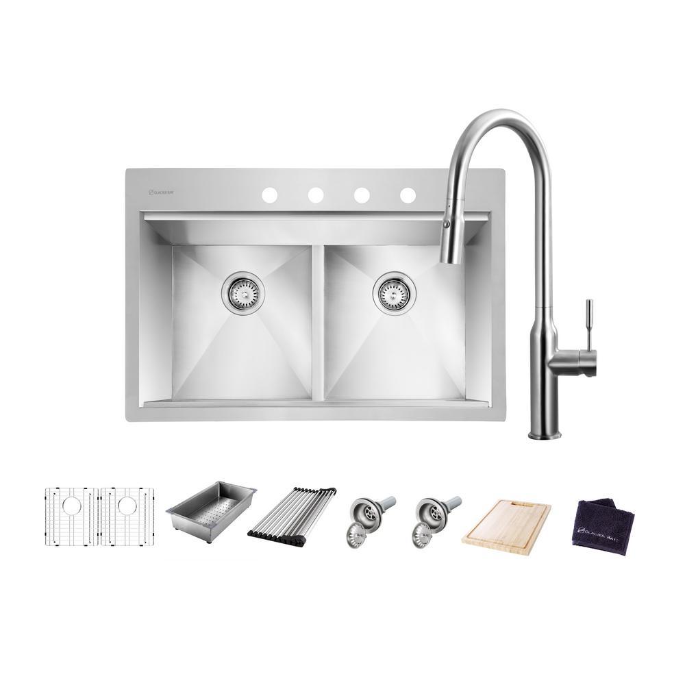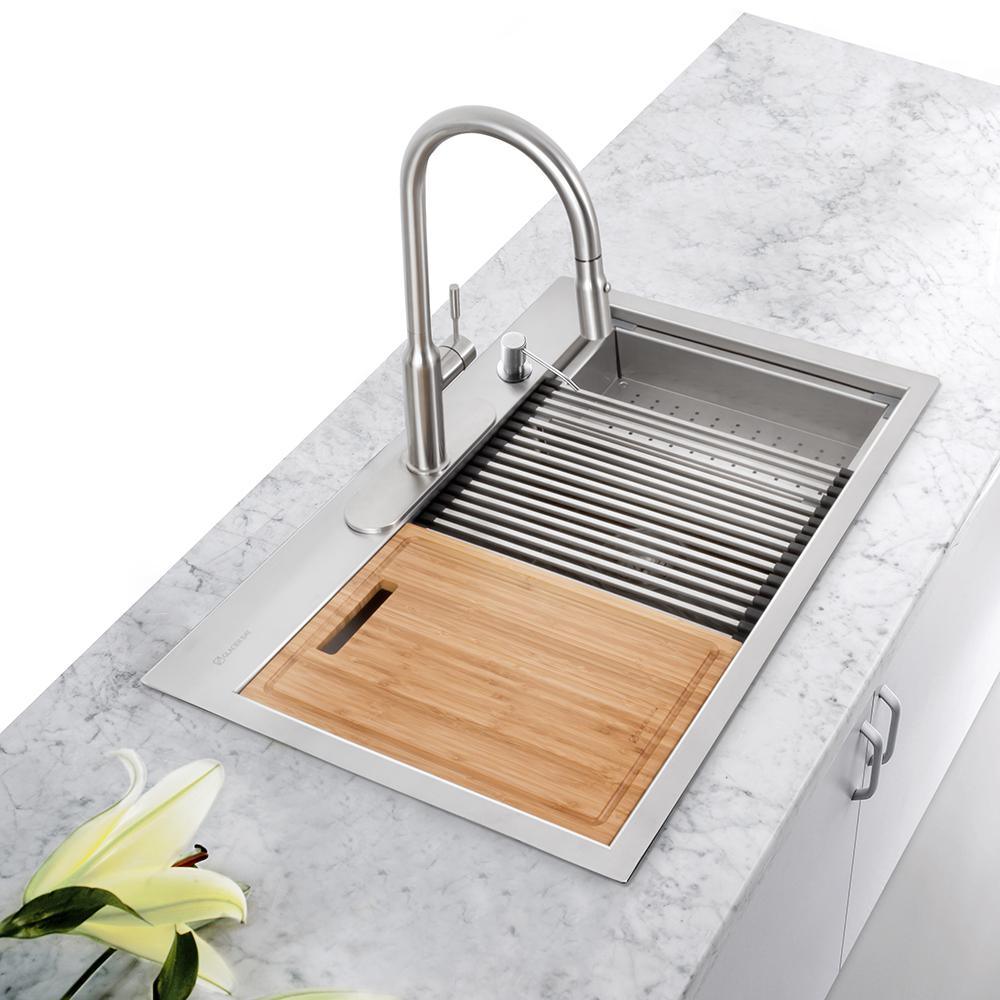 Includes bamboo cutting board, deep stainless-steel colander, and dish-drying roll-up rack that all slide on the ledge converting your sink to a workspace. Also included in box: sink, bottom rinse grid, drain & strainer, cutout template, mounting clips, and installation manual