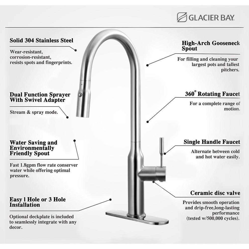 Includes faucet made of lead-free solid T-304 stainless steel and features a pull-down 360° rotating spout, with 90° rotation single handle operation and dual-function spray head