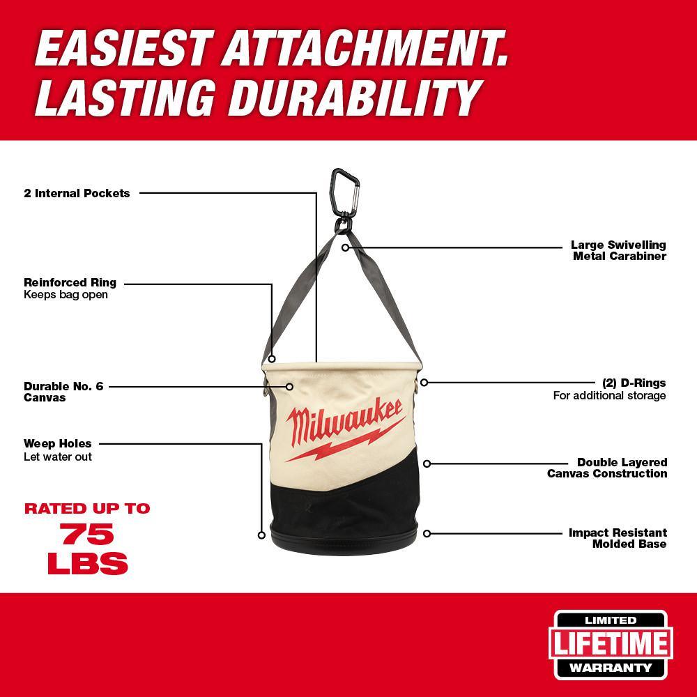 The MILWAUKEE Canvas Utility Bucket with Pockets is built with lineman and power utility trades in mind. The lineman bucket organizer features a large, swiveling metal carabiner for the easiest attachment and a double-layered no. 6 canvas construction for lasting durability. The carabiner has a large gate opening that allows users to clip it into place wherever they are working. The storage bucket has an impact-resistant base and a 75-pound carrying capacity. Built-in weep holes allow water drainage after extended jobsite use. A reinforced ring keeps the bag open for a longer-lasting storage solution. Two internal pockets and 2 D-rings provide users with additional storage.