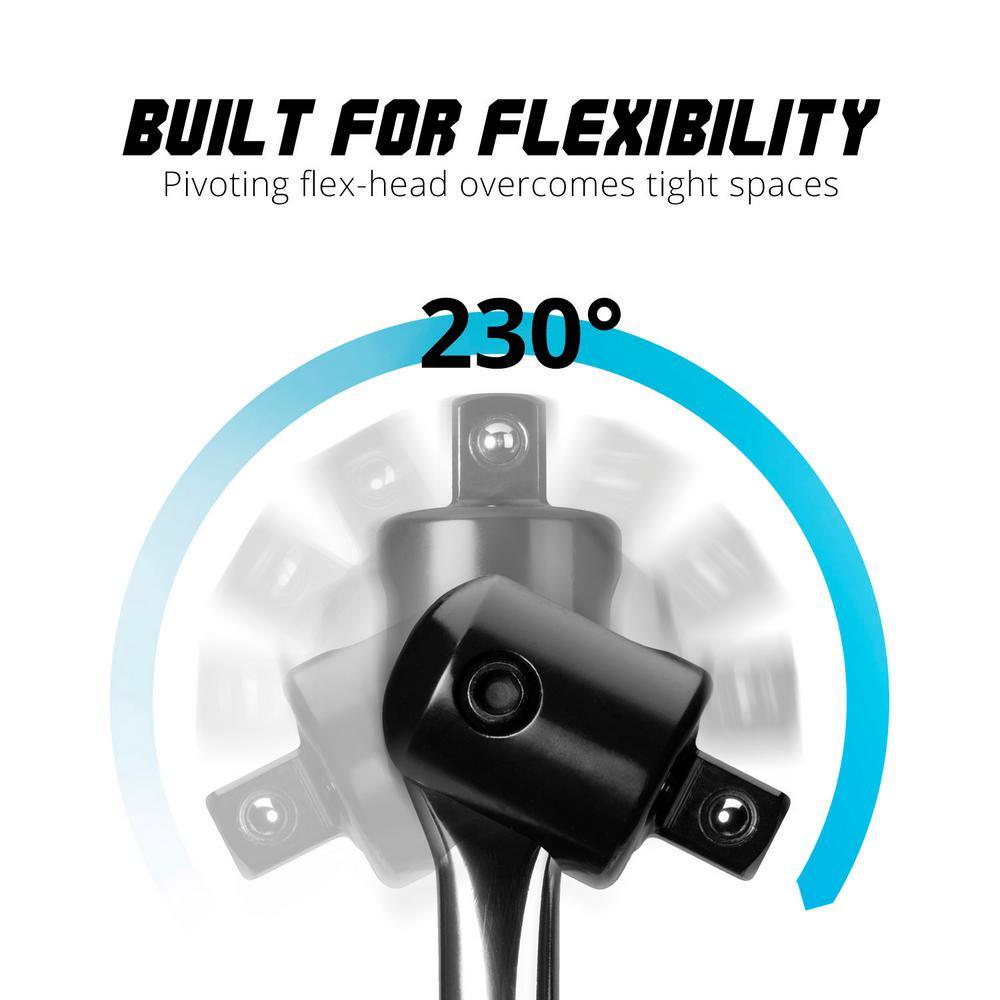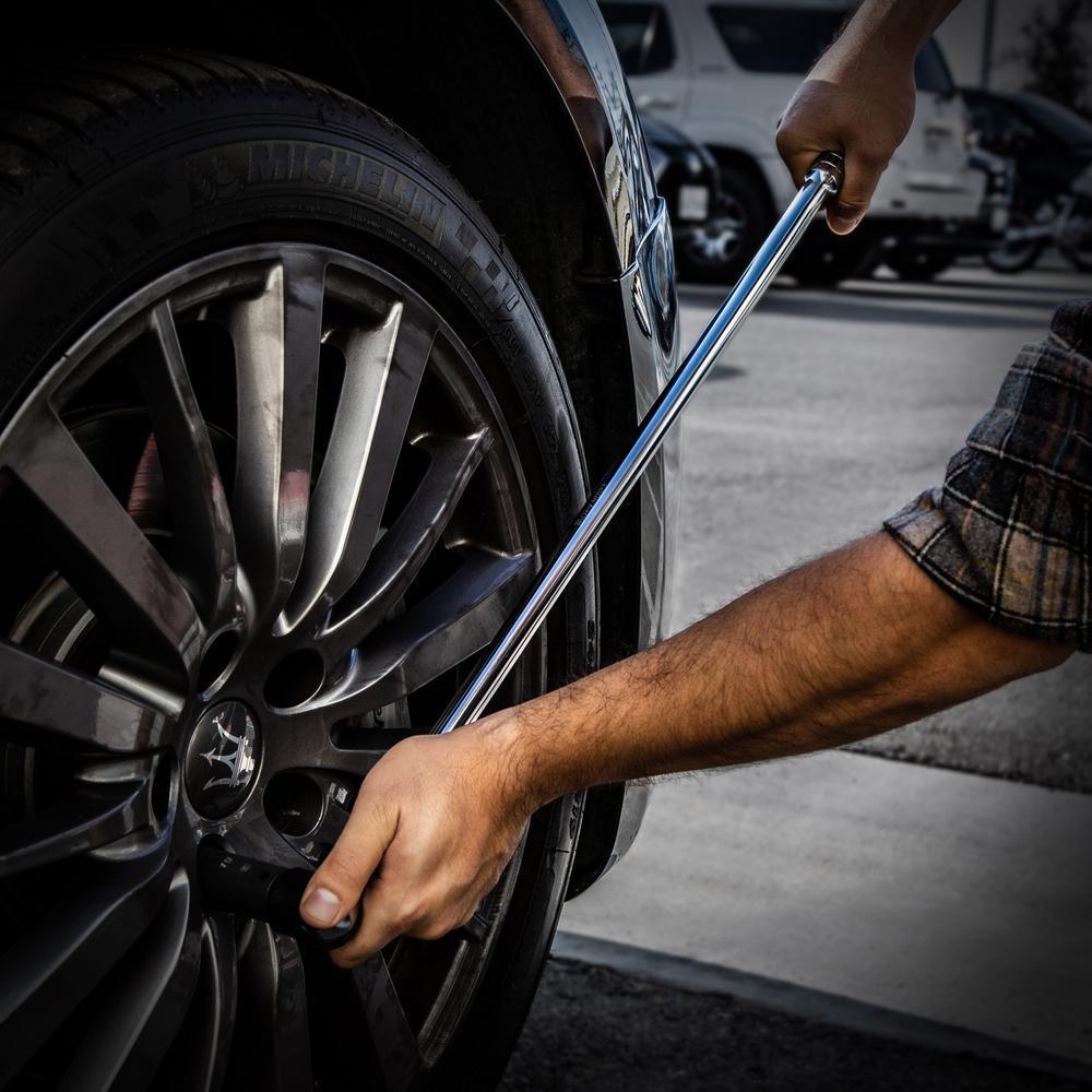 This powerful breaker bar functions as an extension bar that securely holds socket wrench style sockets with extra leverage to break loose frozen and stuck nuts and bolts. Extended 30 in. L, 25% longer than standard, give you extra leverage and makes your job easier. The Chrome Vanadium body is paired with a Chrome Molybdenum head, making for an extremely strong and durable breaker bar. The sockets are kept firmly secure by the spring loaded ball bearing. The head rotates 230-degrees to provide you with dynamic options for a variety of jobs.