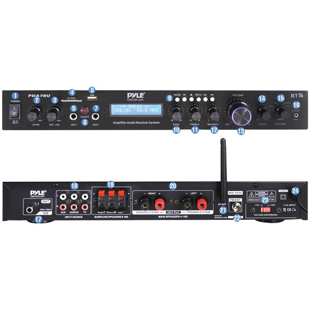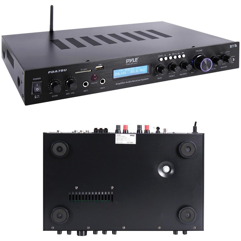 Make this Home Theater Audio Receiver Sound System with Bluetooth the center of your home entertainment center. Not only can you plug in flash drives and SD Cards to listen to MP3 files, Bluetooth streaming and aux hardwiring connects many more devices. The FM radio adds yet another dimension of listening pleasure. This amplifier receiver also has 2 microphone inputs, a subwoofer output and 2 kinds of speaker connectors.