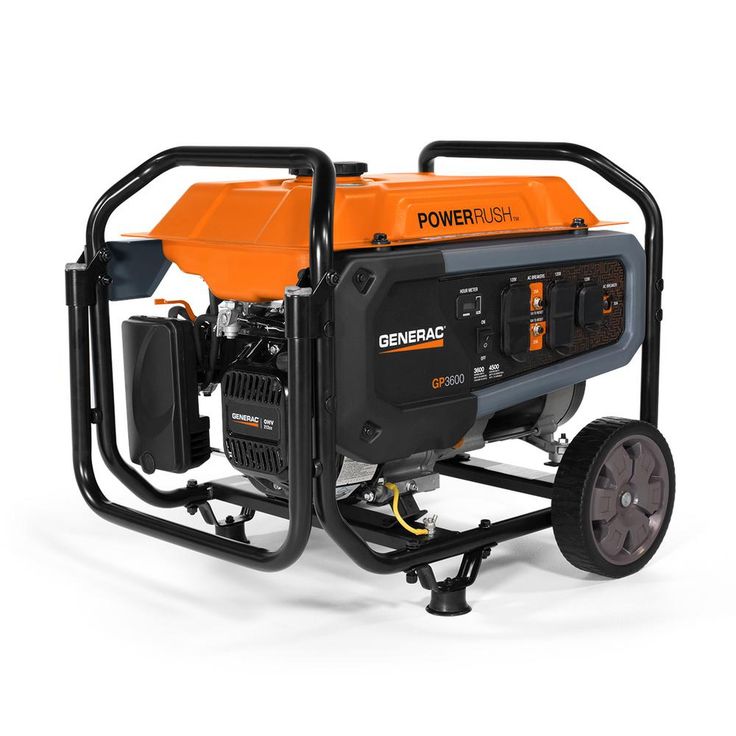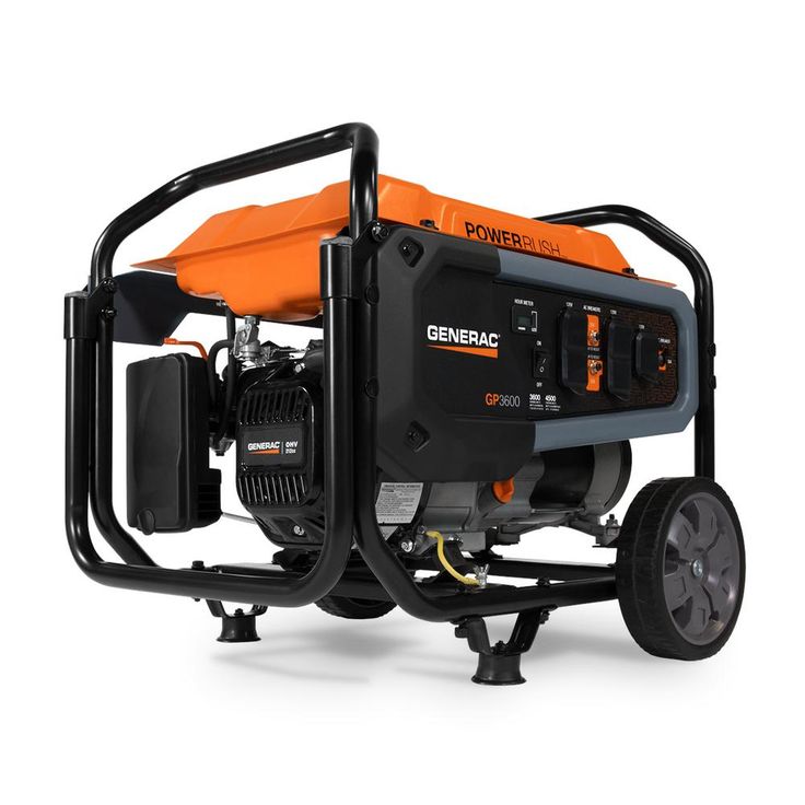 Regular price $519.00The 3600-Watt Generac GP3600 portable generator can be used to tackle home projects, provide power for tools or deliver essential electricity in the case of an outage. It is an especially affordable solution with premium features. These include PowerRush Advanced Technology delivering over 40% more starting capacity an OHV engine for longer engine life and a large-capacity steel fuel tank with an incorporated fuel gauge for durability. The hardened steel tube cradle provides added strength, while the low-oil level shutdown protects your engine from damage. Heavy-duty, never-flat wheels and a foldable handle make for easy transportation of the generator. The compact size of the GP3600 ensures it will take up minimal storage space in the garage.