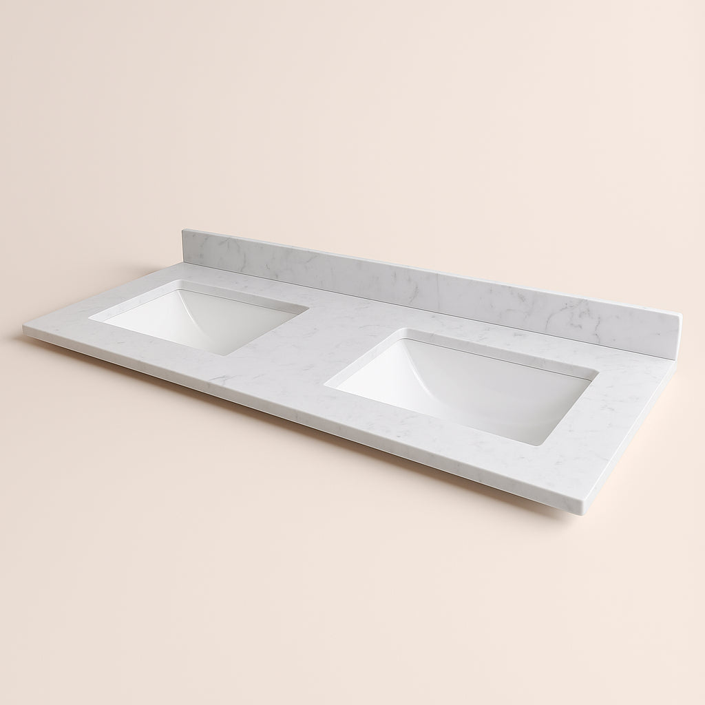 A: The vanity top measures 61 inches in width, 22 inches in depth, and 11.62 inches in height including the backsplash.