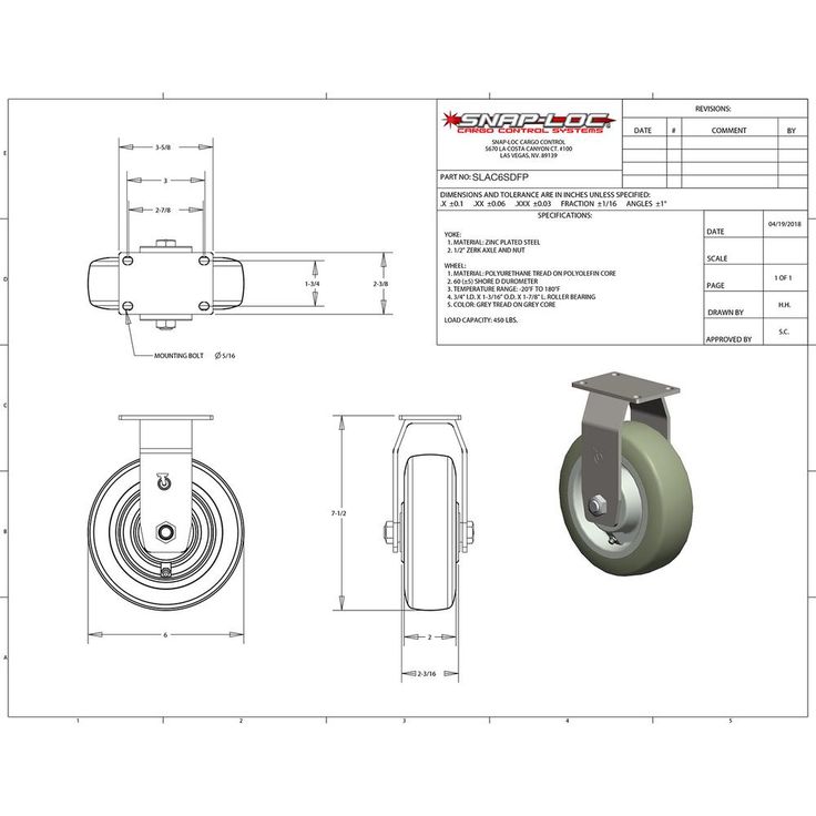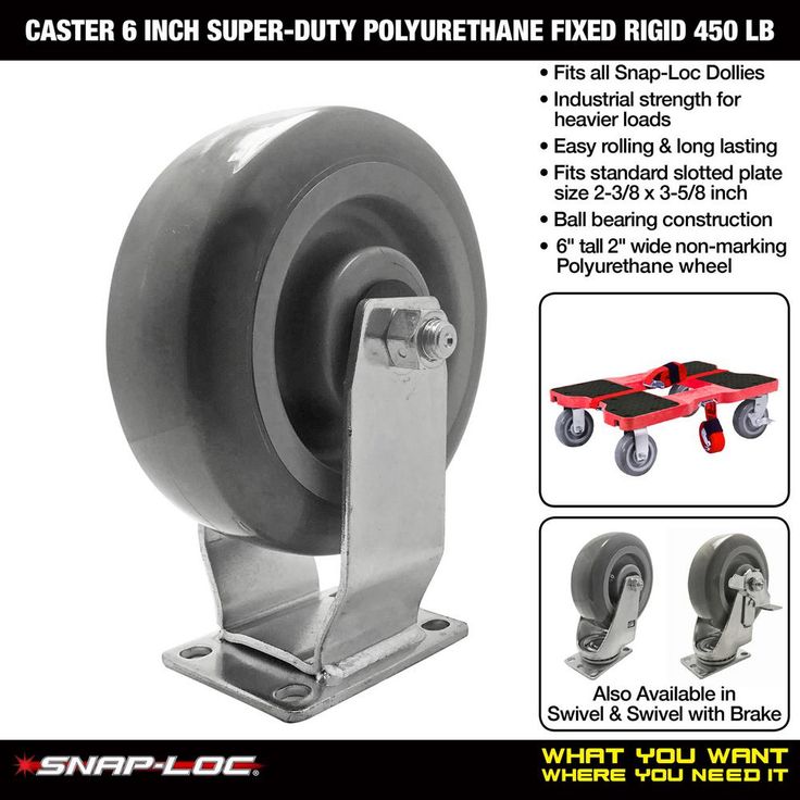Easy rolling Super-Duty 450 lbs. capacity 6 in. Fixed Rigid Caster with standard size 2-3/8 in. x 3-5/8 in. slotted plate. Use this caster when you need the absolute best in it's class. This industrial strength Polyurethane caster is the toughest available for hauling heavier loads with easy rolling. This fantastic caster is made from a heavy-duty steel housing with ball bearings and non-marking airless 6 in. oversized polyurethane wheel with a ground contact width of 1-1/2 in. Overall height of assembly is 7 in. with a top plate bolt slot of 1-3/4 in. x 2-7/8 in. on center. It is the perfect replacement caster for any standard dolly and also for all SNAP-LOC Dollies and SNAP-LOC Carts. SNAP-LOC gives you Ultimate Cargo Control and also fits with other industry standard E-track accessories. Try SNAP-LOCS E-track Singles the Fastest, Safest and Easiest way to strap stuff Where You Need It on pickups, trucks, trailers, racks, walls, ceilings, floors and more. Only The SNAP-LOC System offers a permanent comprehensive solution for all your cargo management needs with a coordinating variety of Straps, Accessories, Dollies, Carts and more. (SNAP-LOC is a trademarked system with patent protected exclusive products).