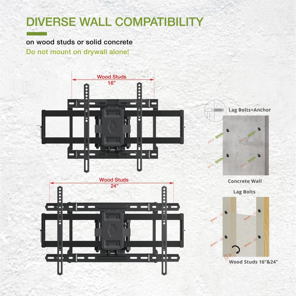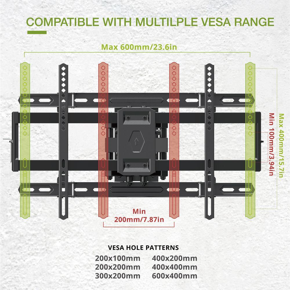 Universal design: heavy duty unit fits for most of 42 in. - 80 in. TVs up to 99 lbs., with VESA/mounting holes 200x100, 200x200, 400x200, 400x400, 600x400, our mounts are tested with 2 times loading weight claimed, images will help you distinguish if this mount perfectly fits your TV in the aspects: VESA, studs spacing and possible blocked input, if not, please check other mounting dream mounts for a better choice