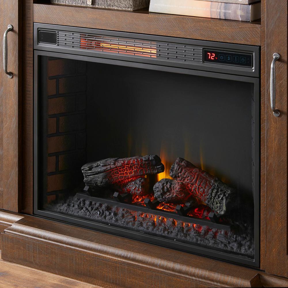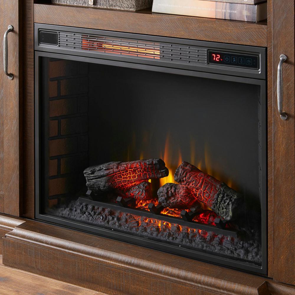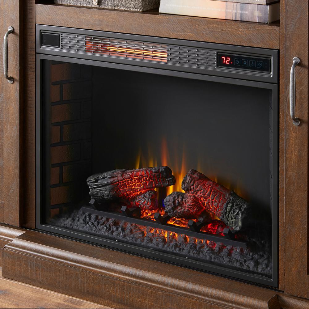 This media console TV stand with electric fireplace was designed to add ambiance and warmth to your home. Sliding doors reveal the 28 in. infrared quartz electric fireplace. Through infrared heating technology, the natural humidity in your home is maintained for comfortable heat that doesn't dry out the room's air. Providing supplemental zone heating for up to 1,000 sq. ft. and showcasing stunning flame effects, this electric fireplace is sure to create a welcoming environment. Spectrafire flame effect technology offers 3 blue and 3 amber effect options to create your ideal fire, displayed on a realistic log set and ember bed. The flame effects can be used with or without heat for year-round enjoyment. Glass front firebox stays cool to the touch for use around children and pets. Change the settings easily using the control panel on the unit or with the included remote control. The center media shelf and side cabinets include pass through holes for your media components while adjustable shelves offer customizable storage for all your entertainment accessories. This TV stand accommodates most flat screen TVs up to 80 in. or up to 155 lbs. Tip restraint hardware is included to help prevent accidents and damage.