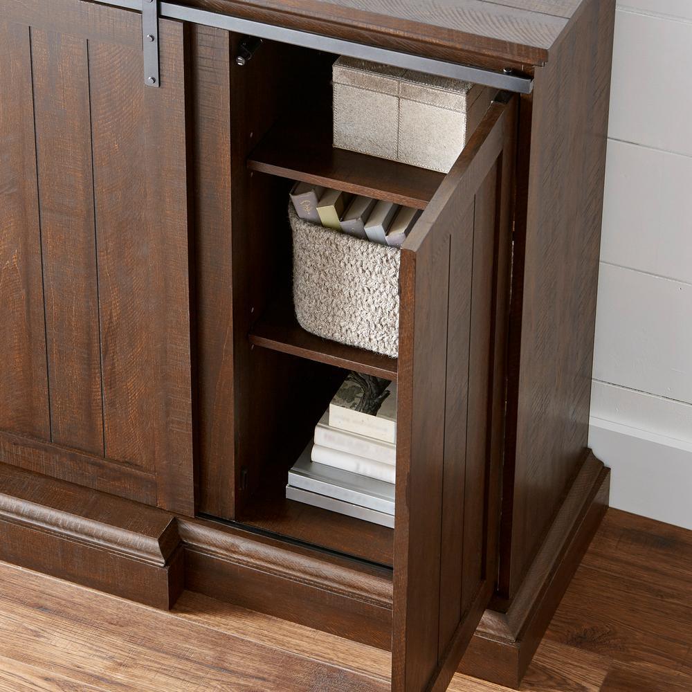 Design features planked top and real sliding barn doors in rustic walnut finish with pewter handles