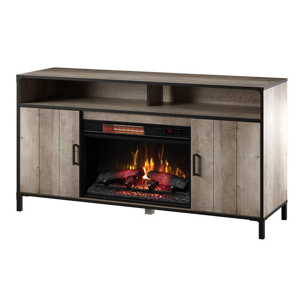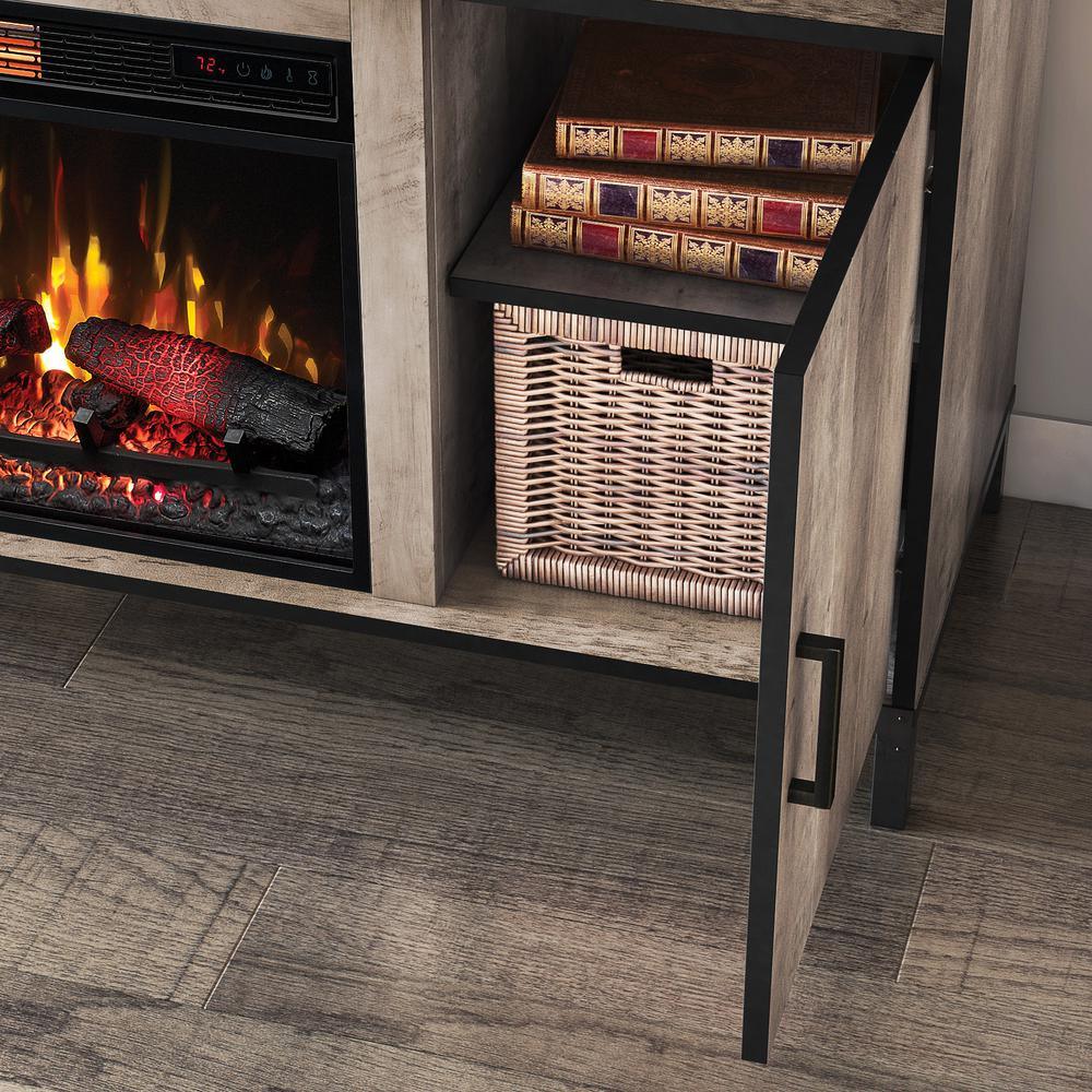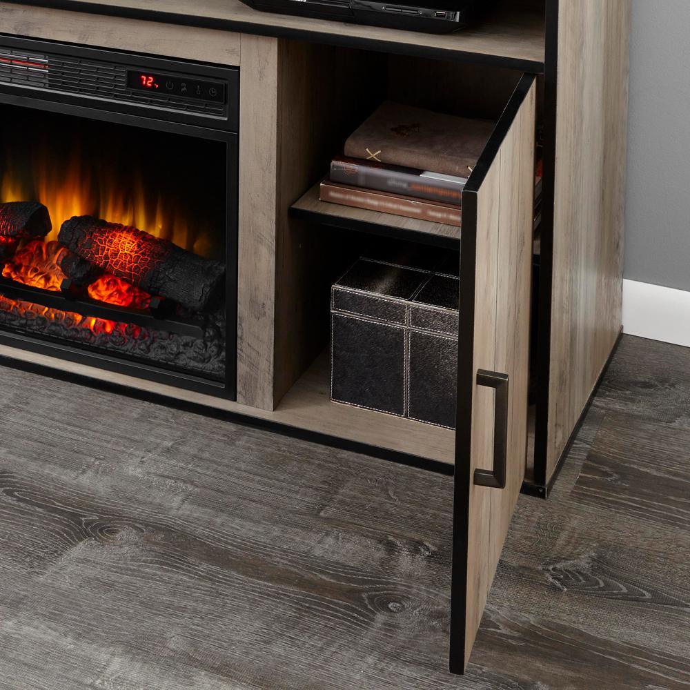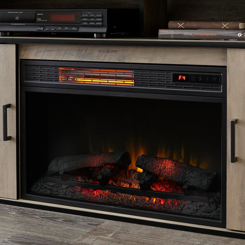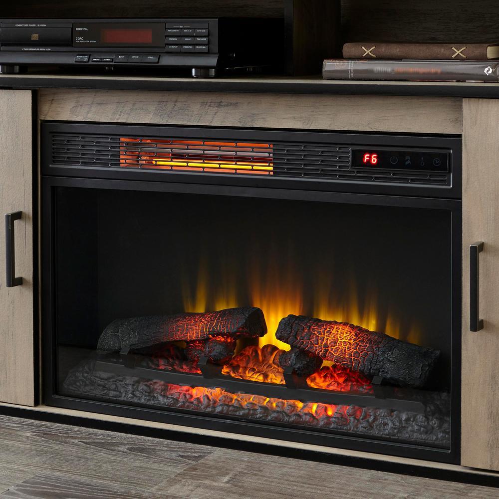 Heat your living room in style with this TV stand with infrared quartz electric fireplace. The stand can hold most televisions up to 65 in. or up to 90 lbs. and media components can be stowed on the partitioned media shelf. Store additional entertainment and living room accessories in the chic, planked cabinets with adjustable shelves for customizable storage. Watch your favorite movies and TV shows while supplemental zone heating warms up to 1,000 sq. ft. of your home. Because it maintains the natural humidity in the air, the infrared heat won't dry out your home. The featured Spectrafire flame effect technology brings flames to life with three blue and three amber effect options on a realistic log set and ember bed. Enjoy the beauty of the flames with the heat on or off for a relaxing ambiance in your home all year long. Change the settings on the control panel of the unit or with the included remote control to achieve your ideal fire.