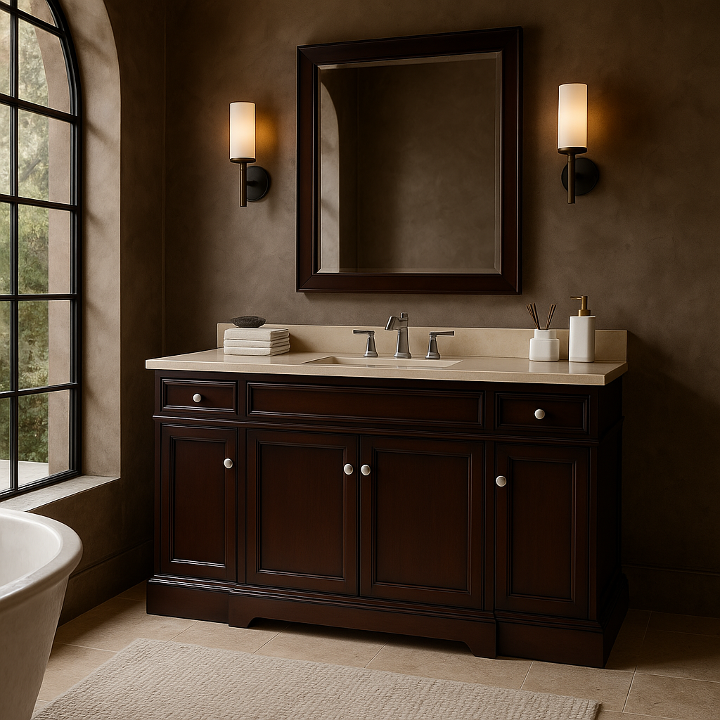 The Teagen 58-inch bathroom vanity combines timeless design with modern functionality. Featuring dark espresso cabinetry, a warm beige cultured marble countertop, and brushed nickel hardware, it offers ample storage and a sophisticated look.